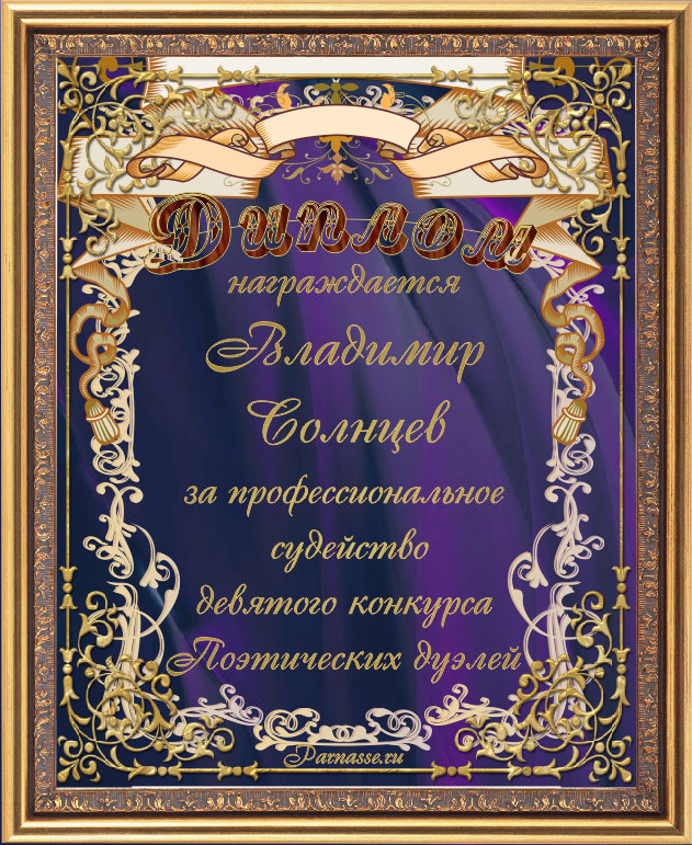 ДИПЛОМ ЗА ПРОФЕССИОНАЛЬНОЕ СУДЕЙСТВО В ДЕВЯТОМ КОНКУРСЕ ПОЭТИЧЕСКИХ ДУЭЛЕЙ