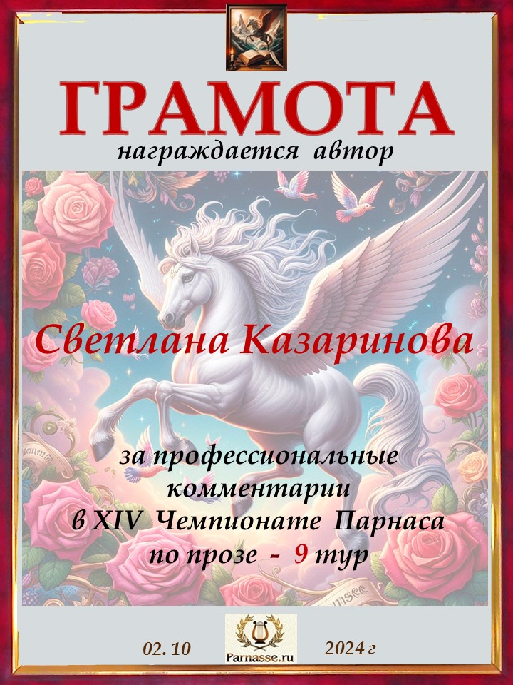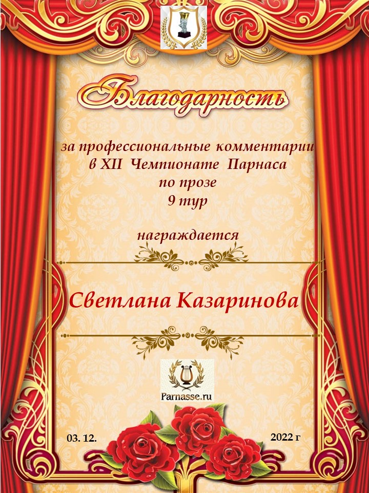 Благодарю за профессиональные комментарии в 9 туре XI Чемпионата Парнаса по Прозе!