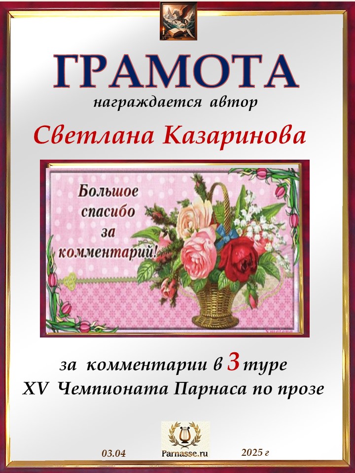 ![]() Медаль комментатора в 3 туре XV Чемпионата Парнаса по прозе