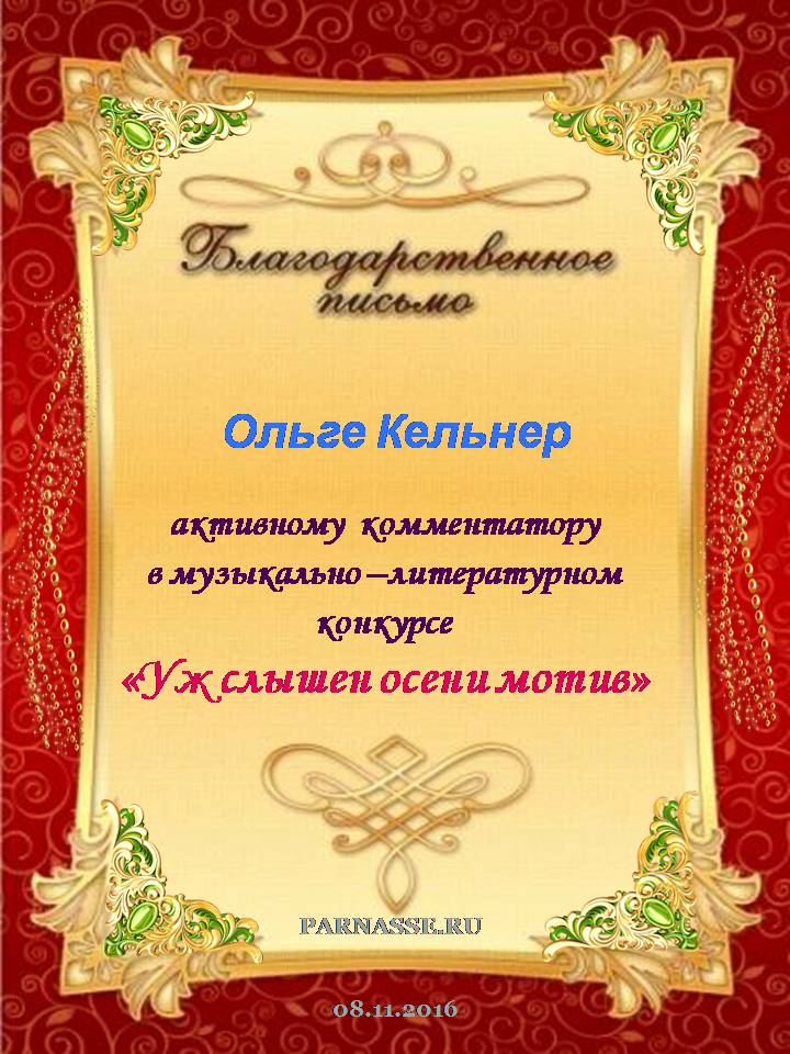 За самые интересные, яркие и развёрнутые комментарии к конкурсным произведениям музыкально-литературного конкурса "Уж слышен Осени мотив". Поздравляем, Ольга, с заслуженной, блестящей, великолепной победой. Спасибо за Вашу искренность, душевность и Ваш писательский талант.