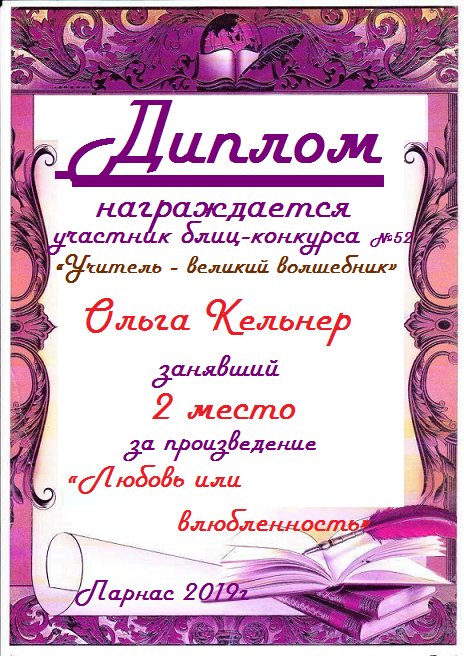 Второе место в Блиц- конкурсе №52 «Учитель - великий волшебник» за произведение «Любовь или влюбленность». Поздравляем!