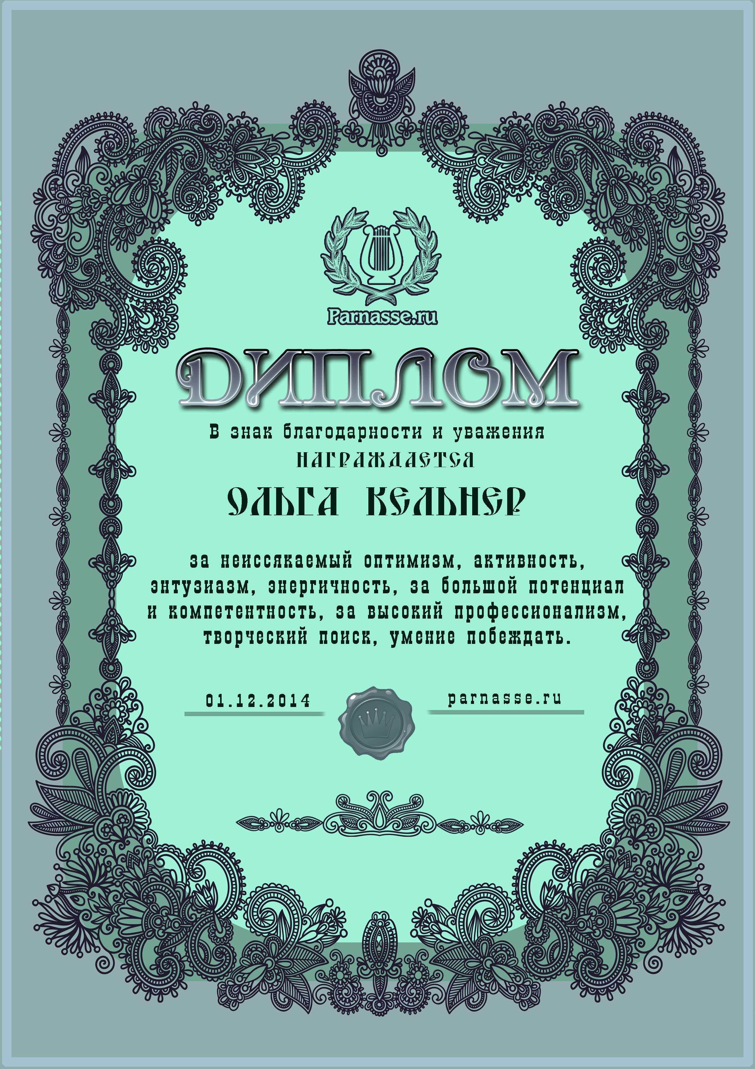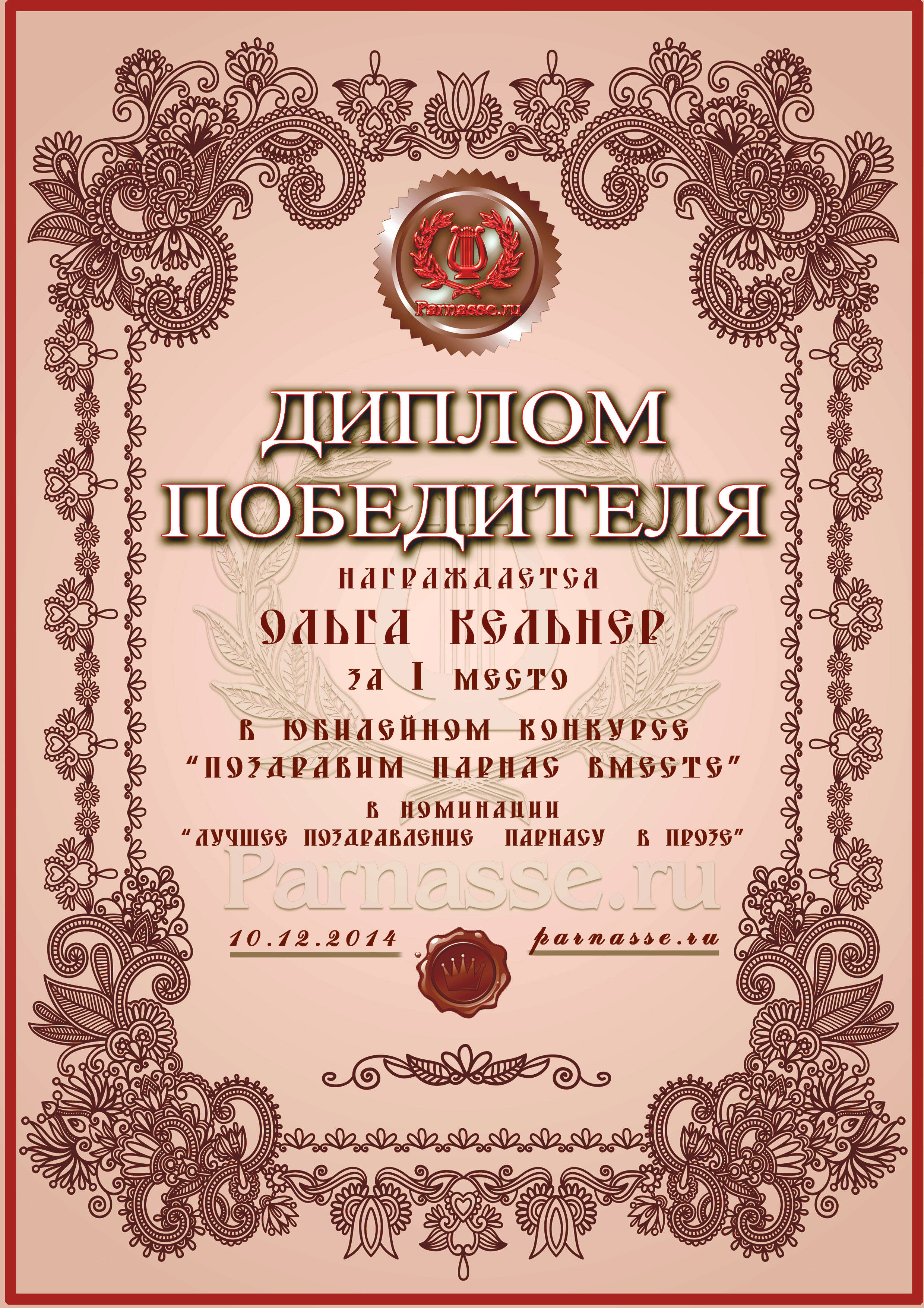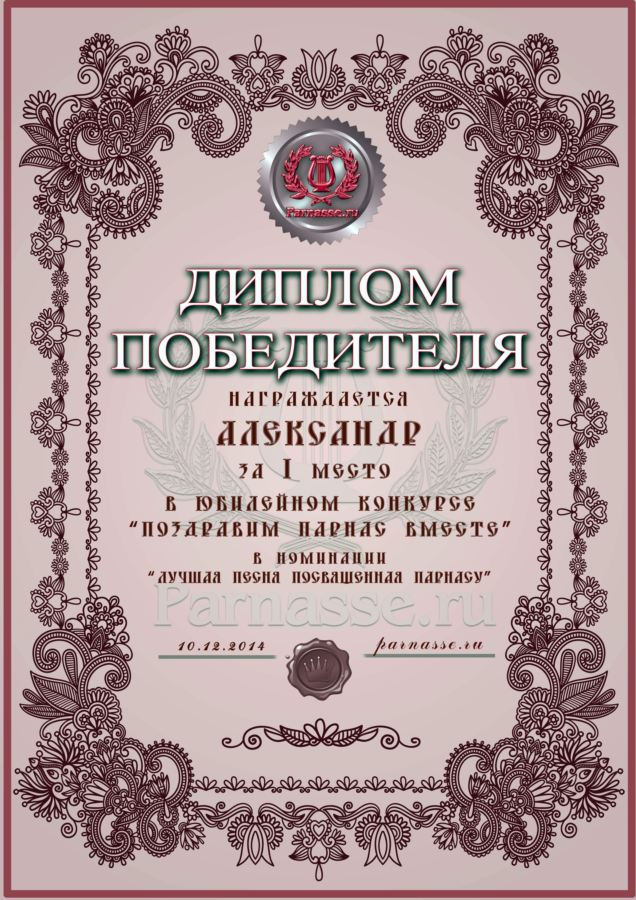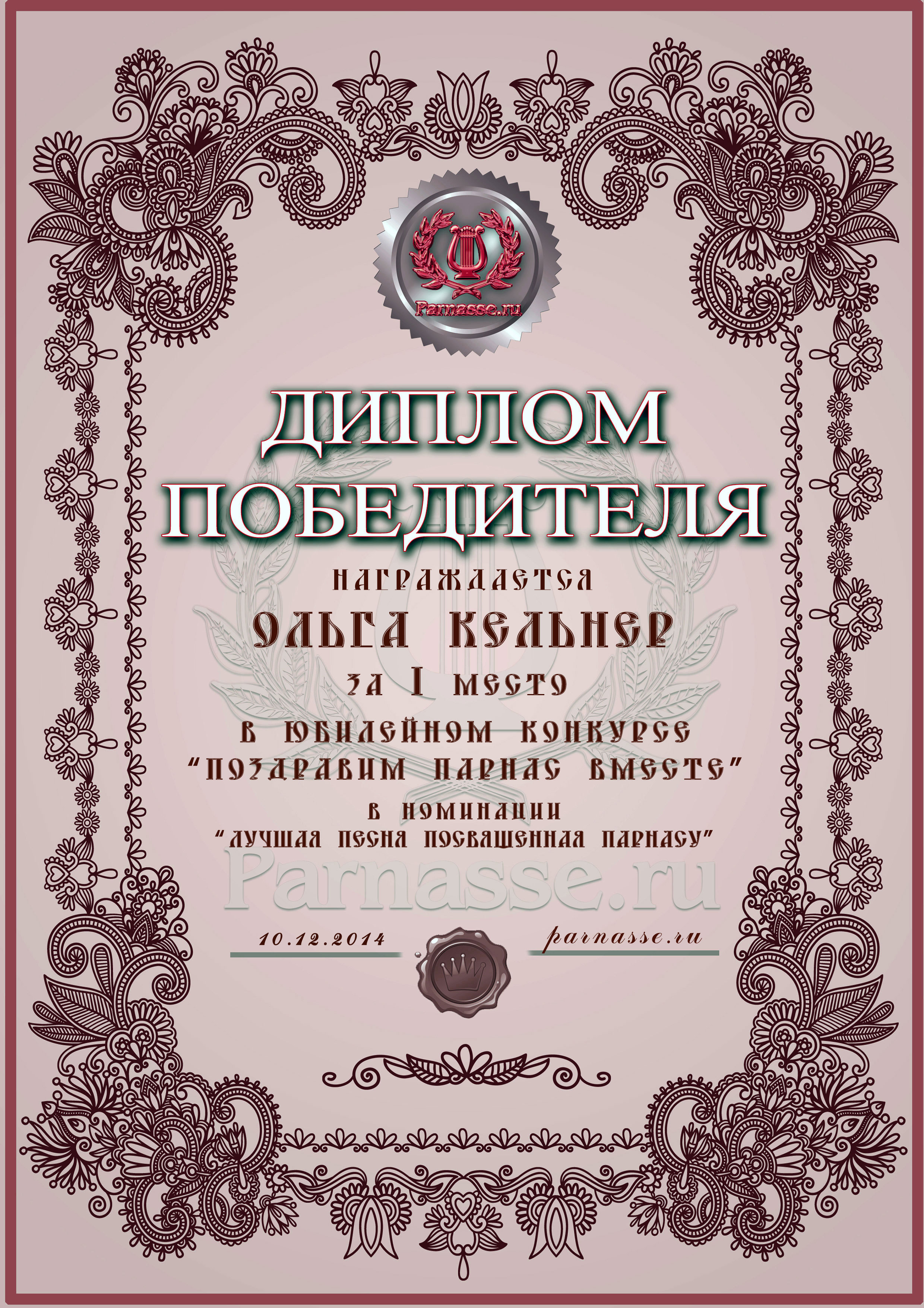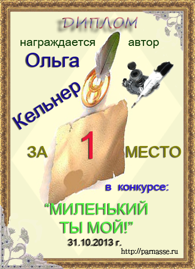 Первое место в праздничном конкурсе "Поздравим Парнас вместе!", в номинации "Лучшая поздравительная песнь Парнасу". Трёхлетний юбилей Парнаса - наш общий Праздник. Примите и Вы наши поздравления и пожелания крепкого Здоровья, Счастья, Вдохновения и творческих Открытий! Спасибо Вам огромное за великолепное музыкальное поздравление, пусть Ваша Муза всегда остается рядом, а Вы – с "Парнасом" на долгие и долгие годы! Произведение "Ах Парнас"