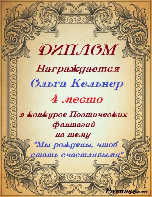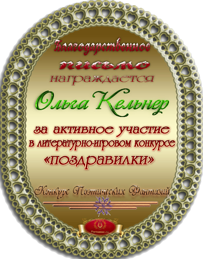 За неугасающую и неисчерпаемую творческую активность, постоянный контакт с Музой и признание сообществом "Парнасцев".От всей души желаем Вам, Ольга, здоровья, любви, успехов, благополучия, удачи и творческого вдохновения!