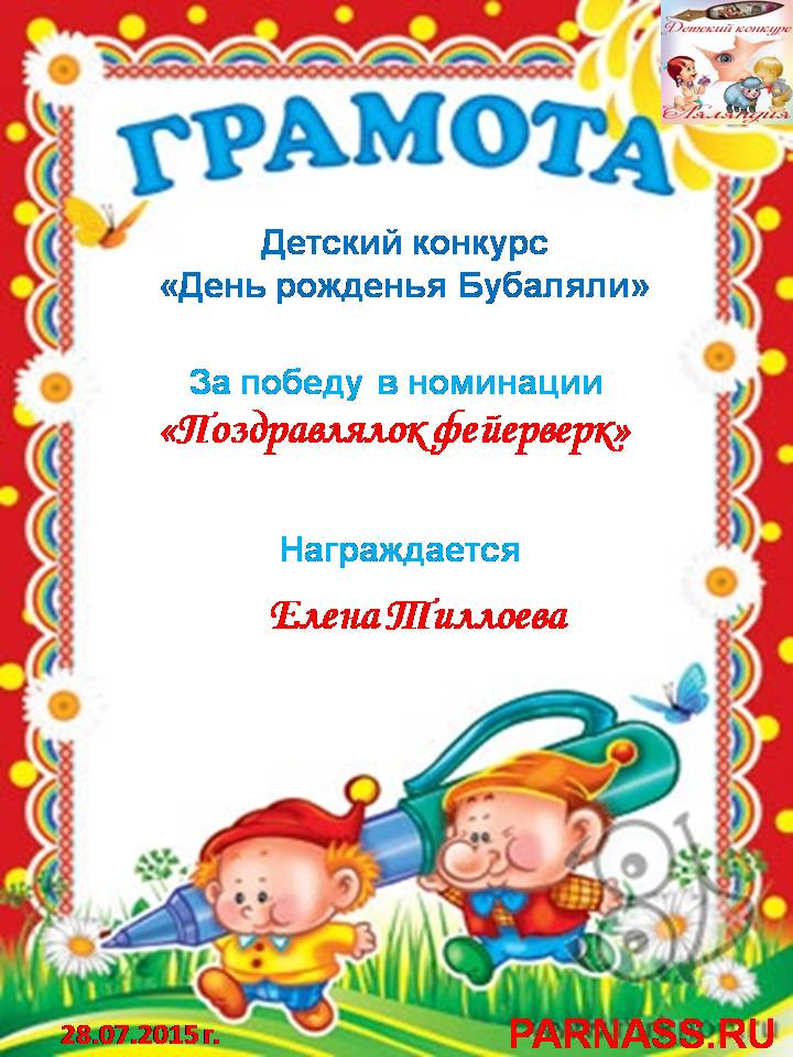 Похвальная грамота за 4 место и активное участие в конкурсе лимериков № 70+ (29.06.2015 г.)