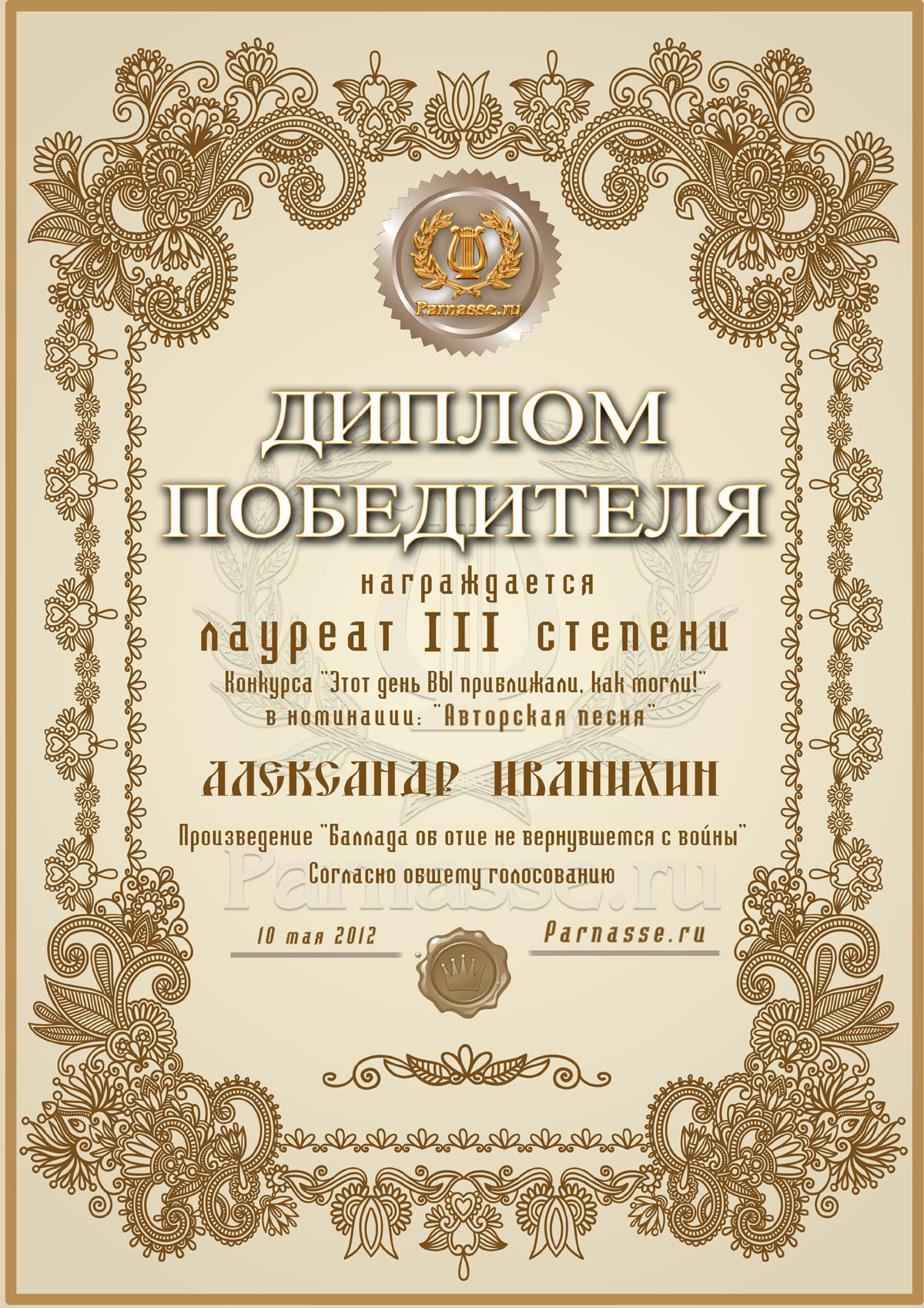 ![]() Бронзовый Кубок "Победитель Третьего Поэтического Турнира"