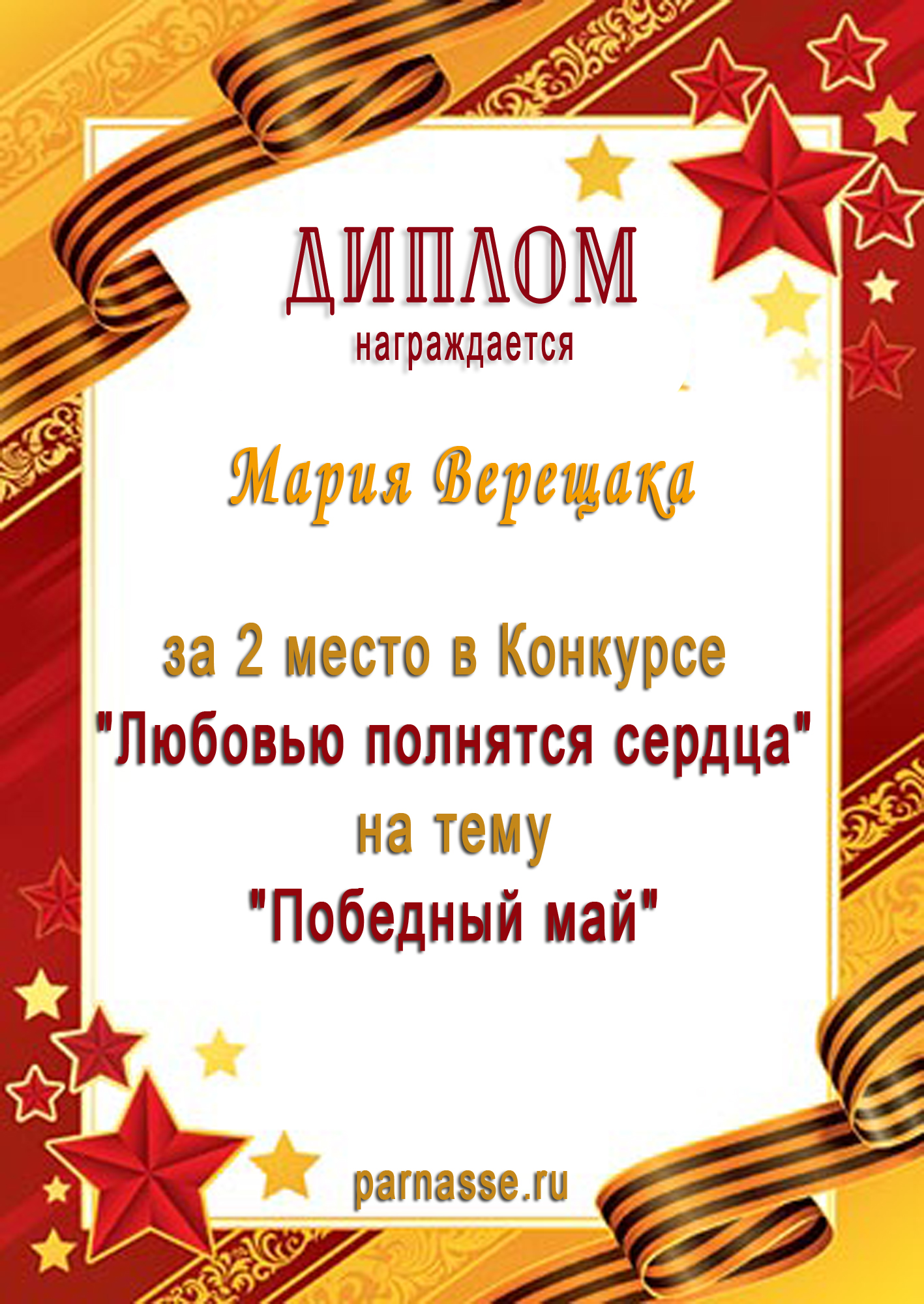 За 2 место в Конкурсе "Любовью полнятся сердца" на тему "Победный май". С днём Победы!