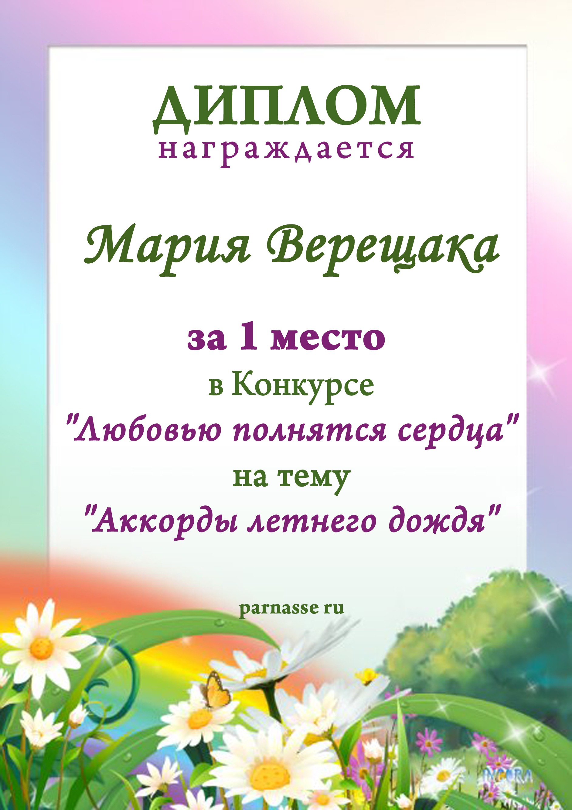 За 1 место в Конкурсе на тему "Аккорды летнего дождя"