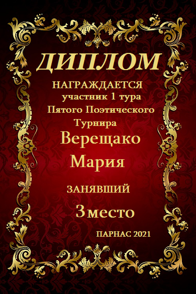 Третье место в 1-м туре Пятого Поэтического Турнира «Признание в любви», за произведение «Опоздавшая любовь». Поздравляем!