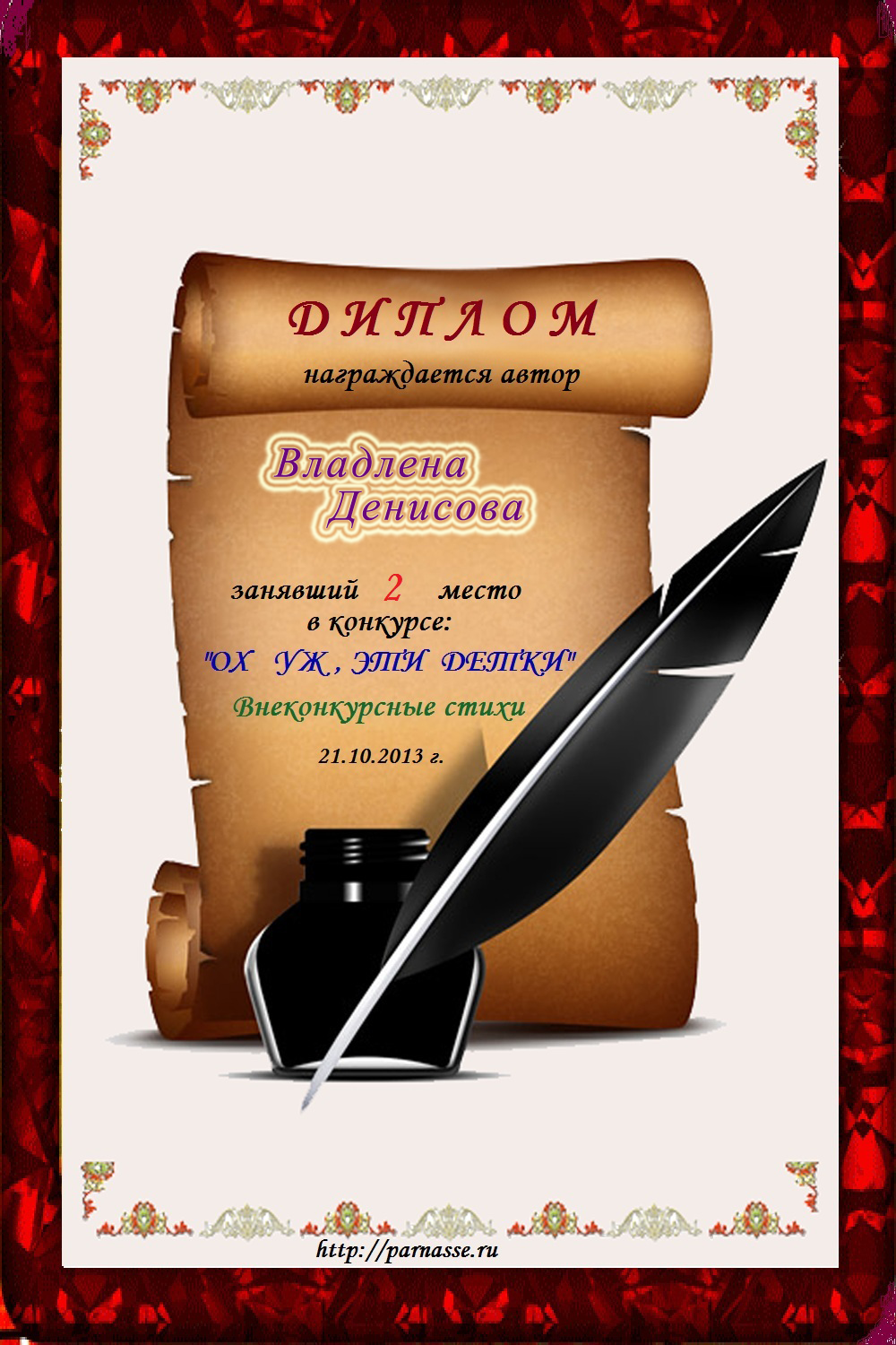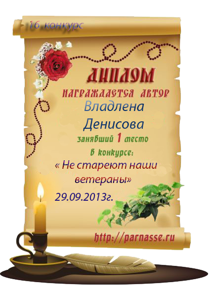 Второе место в конкурсе "Дню всех Влюблённых посвящая", песенная номинация, судейское голосование, автор слов песни "Ах, душа". Поздравляем!