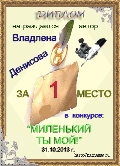 Третье место в музыкально-литературном конкурсе «ЗИМНЯЯ СКАЗКА», в прозаической номинации «Зима и Любовь»! Произведение «ВСТРЕЧА НОВОГО ГОДА»! Поздравляем с блестящей победой в конкурсе, Владлена!