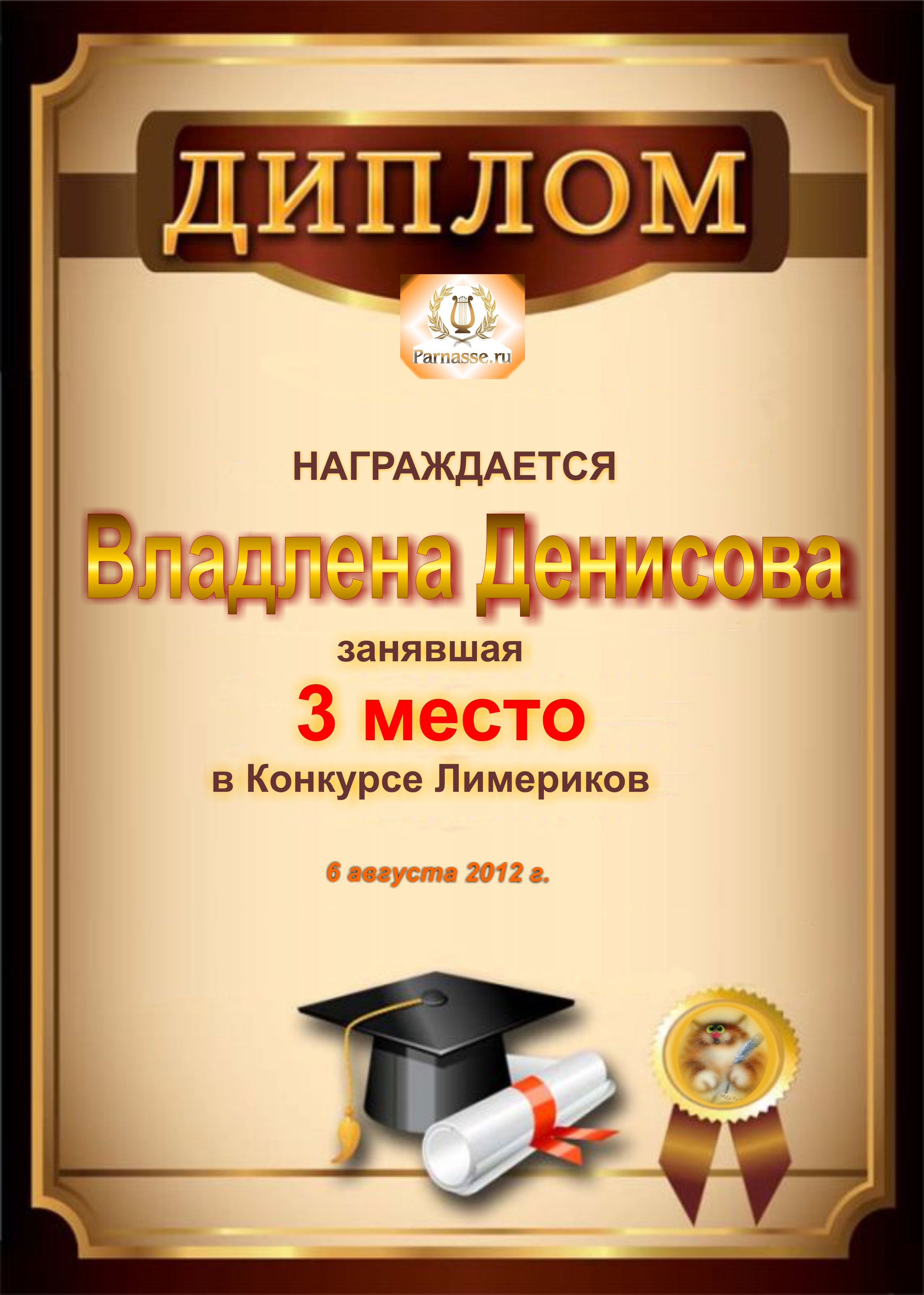 Диплом за победу и 3 место в дополнительной номинации конкурса лимериков № 40+ (19.08.2013 г.)