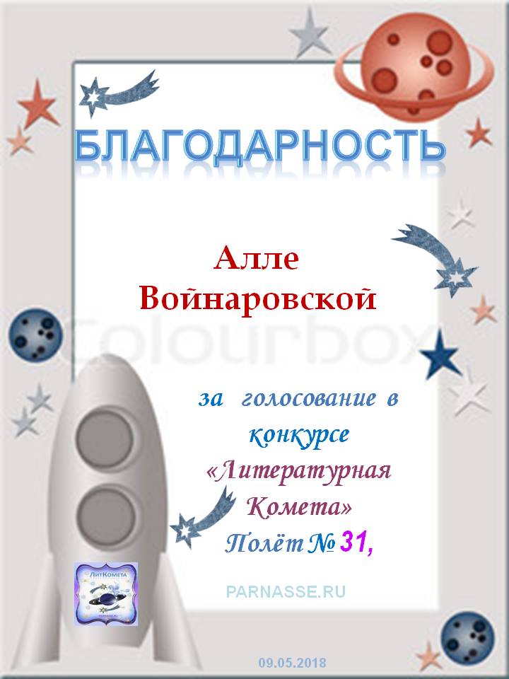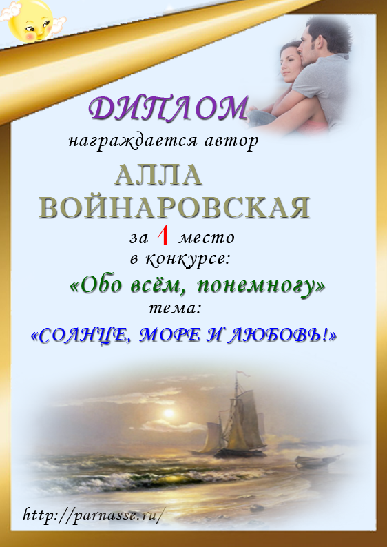 За неугасающую и неисчерпаемую творческую активность, постоянный контакт с Музой и признание сообществом "Парнасцев".От всей души желаем Вам, Алла, здоровья, любви, успехов, благополучия, удачи и творческого вдохновения!