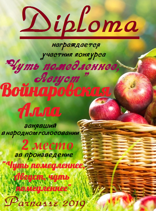 Второе место в конкурсе " Чуть помедленнее, Август", народное голосование. Поздравляем с прекрасной победой!