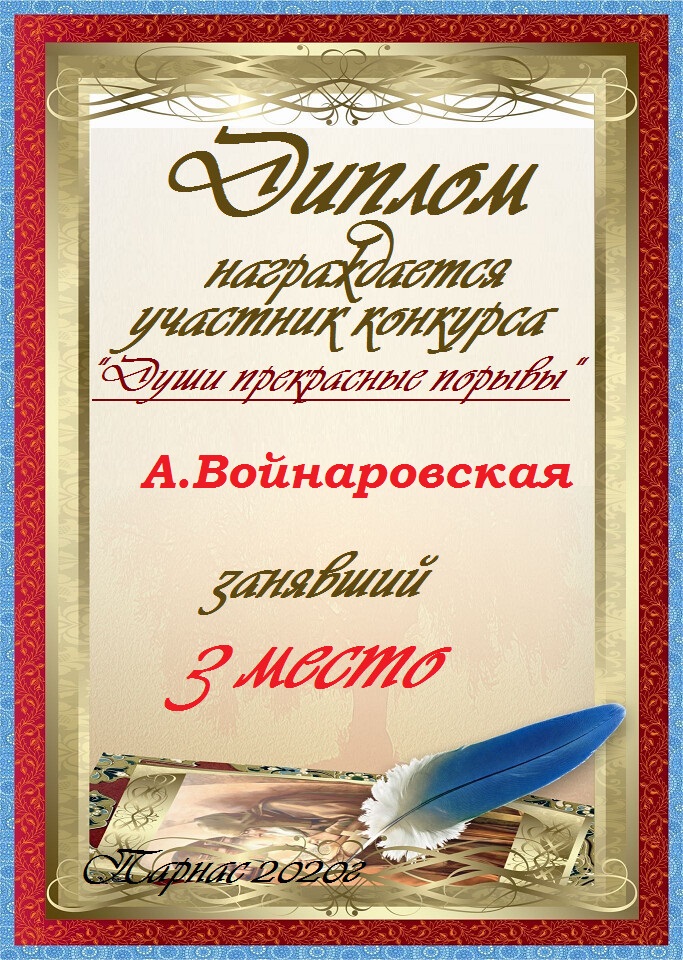 Третье место по итогам конкурса " Вдохновение – росчерк пера", народное голосование. Поздравляем с прекрасной победой!