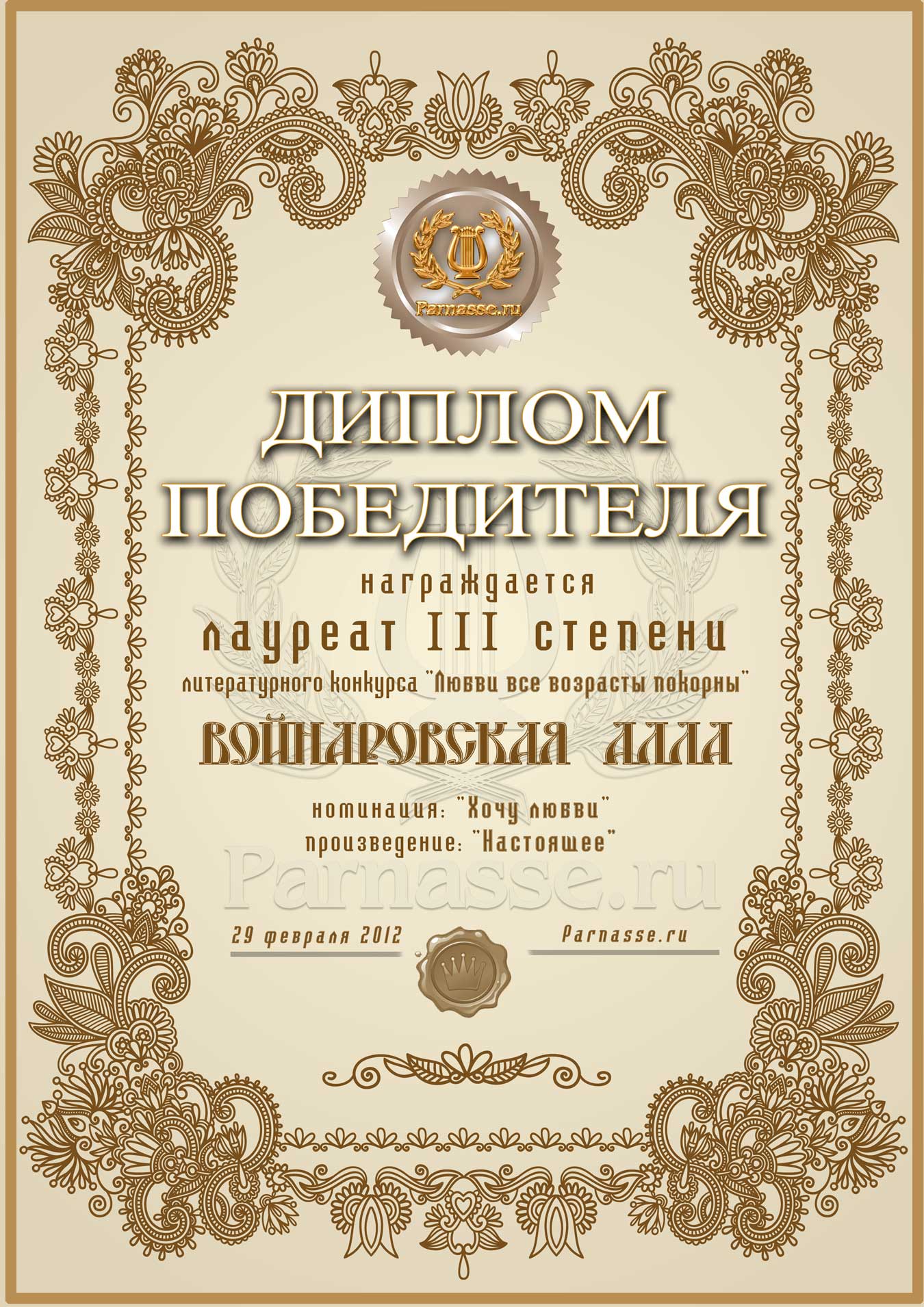 Диплом лауреата III степени лит.конкурса "Любви все возрасты покорны"
