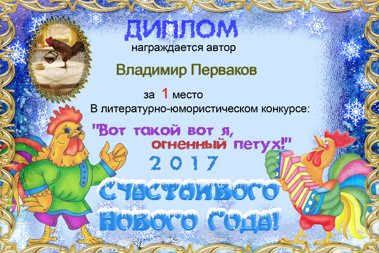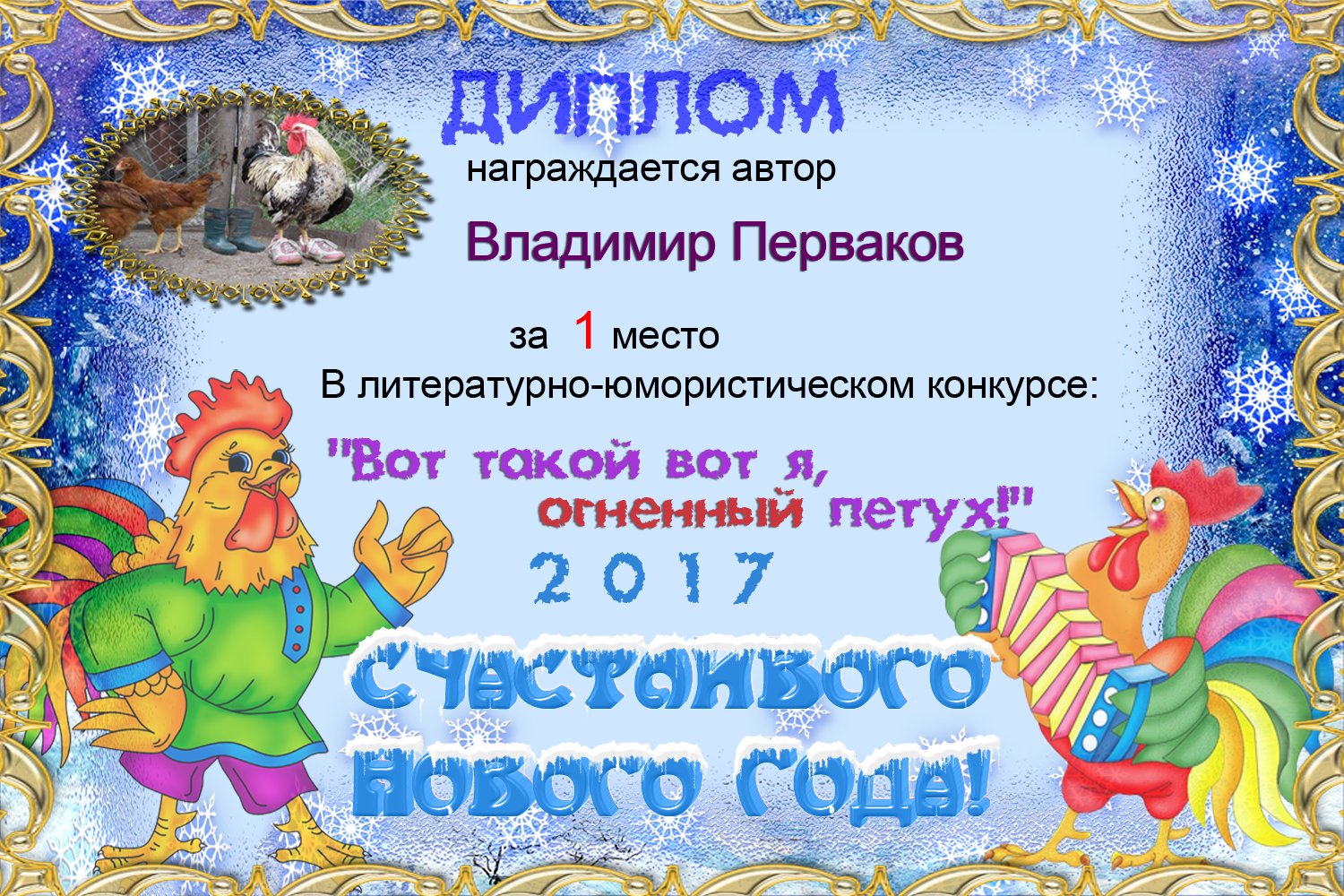 За победу в конкурсе на тему:"Вот такой вот я, огненный петух!"