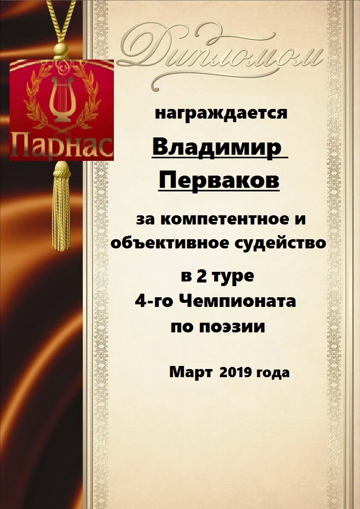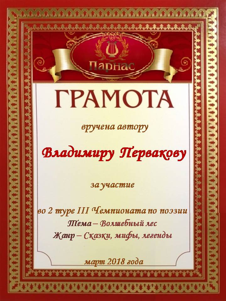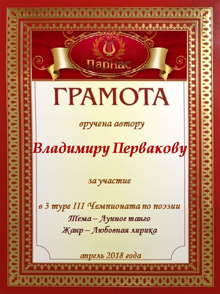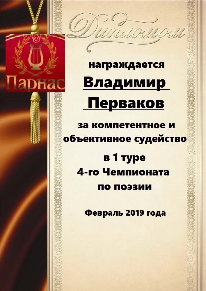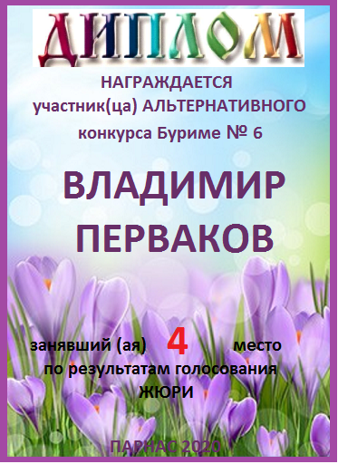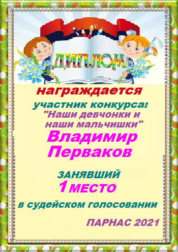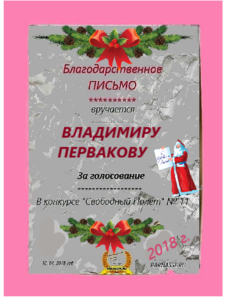 Номинация "Самое необычное поздравление Парнаса с Днём Рождения"Хочется выразить Вам, Владимир, огромнейшую благодарность за неординарное яркое поздравление! Мы благодарны Вам за, то, что именно "Парнас" стал для Вас теплым и дружеским домом, кругом друзей, помощником в публикации своих замечательных произведений в Интернете!