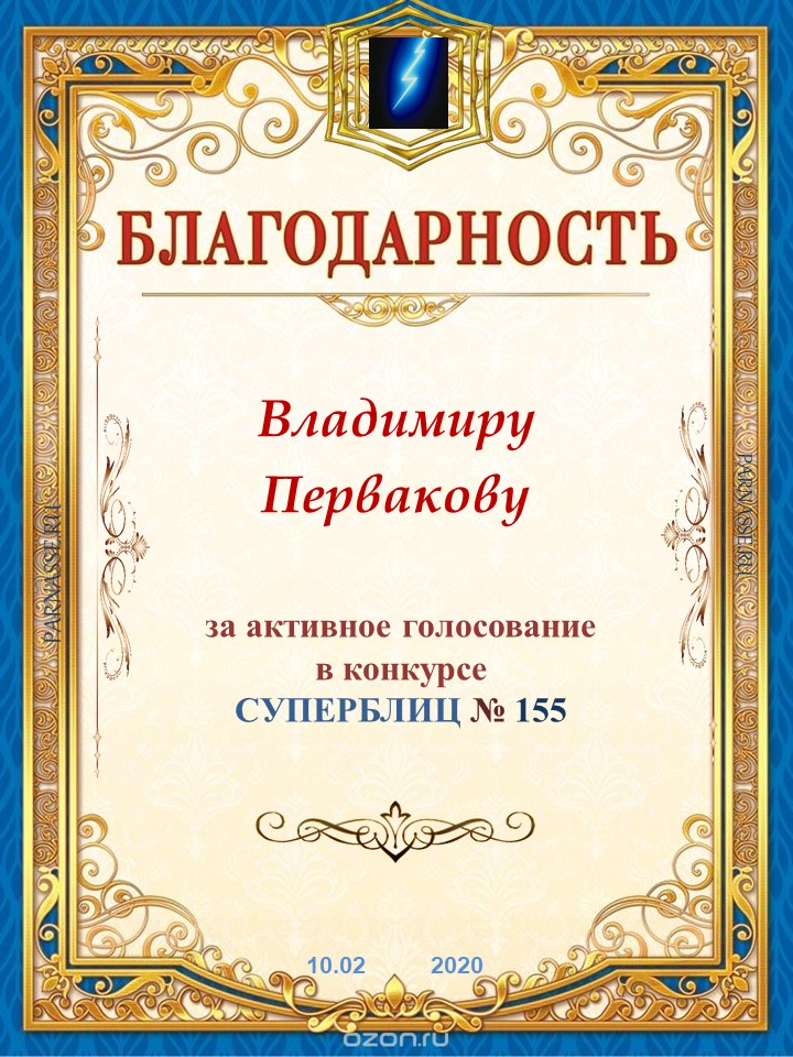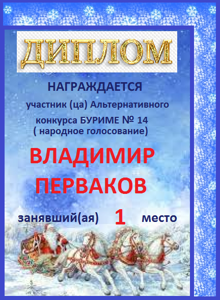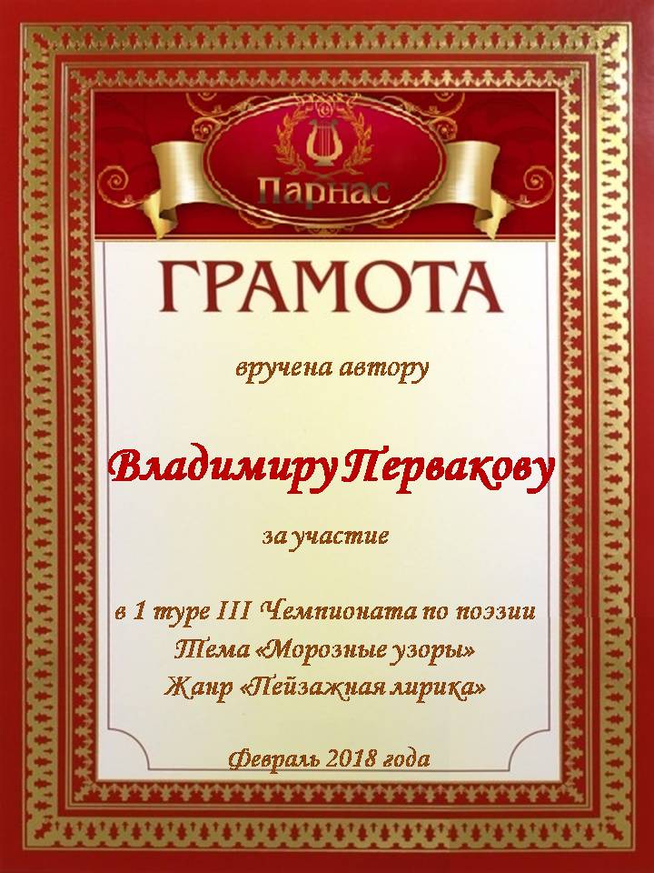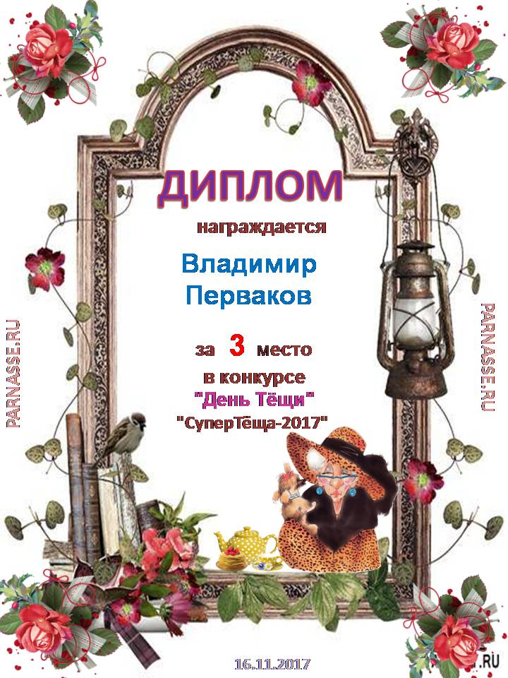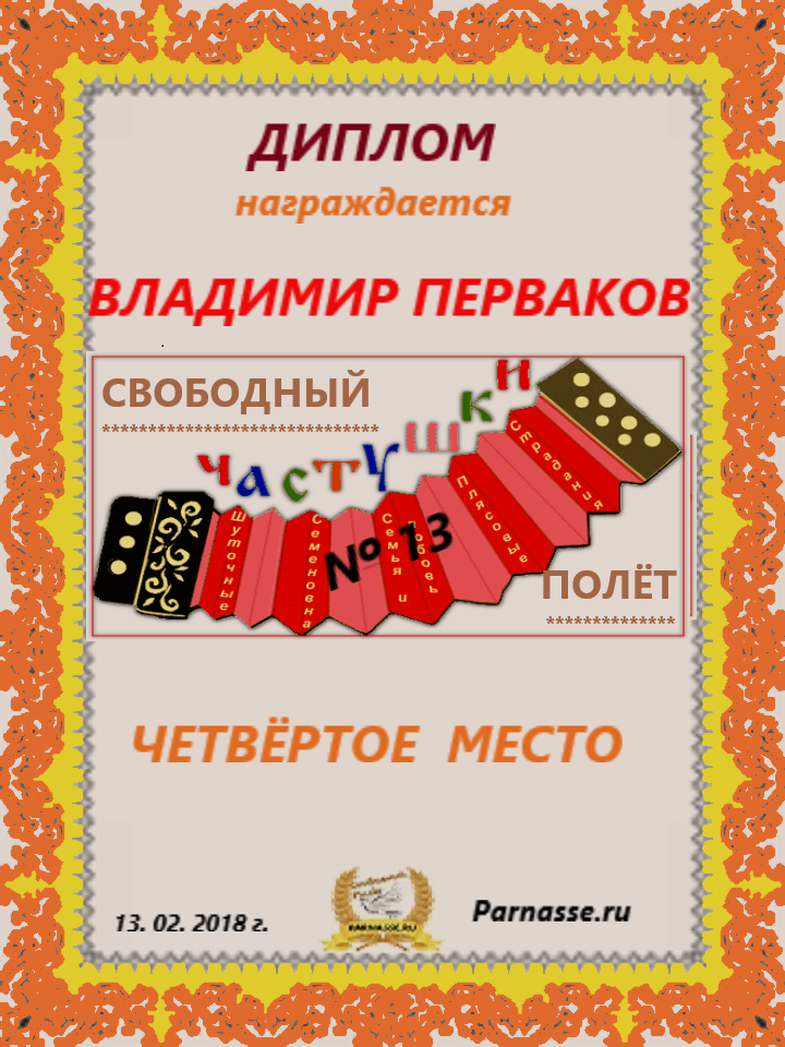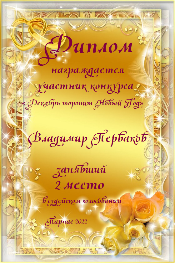 Номинация "Самое необычное поздравление Парнаса с Днём Рождения"Хочется выразить Вам, Владимир, огромнейшую благодарность за неординарное яркое поздравление! Мы благодарны Вам за, то, что именно "Парнас" стал для Вас теплым и дружеским домом, кругом друзей, помощником в публикации своих замечательных произведений в Интернете!