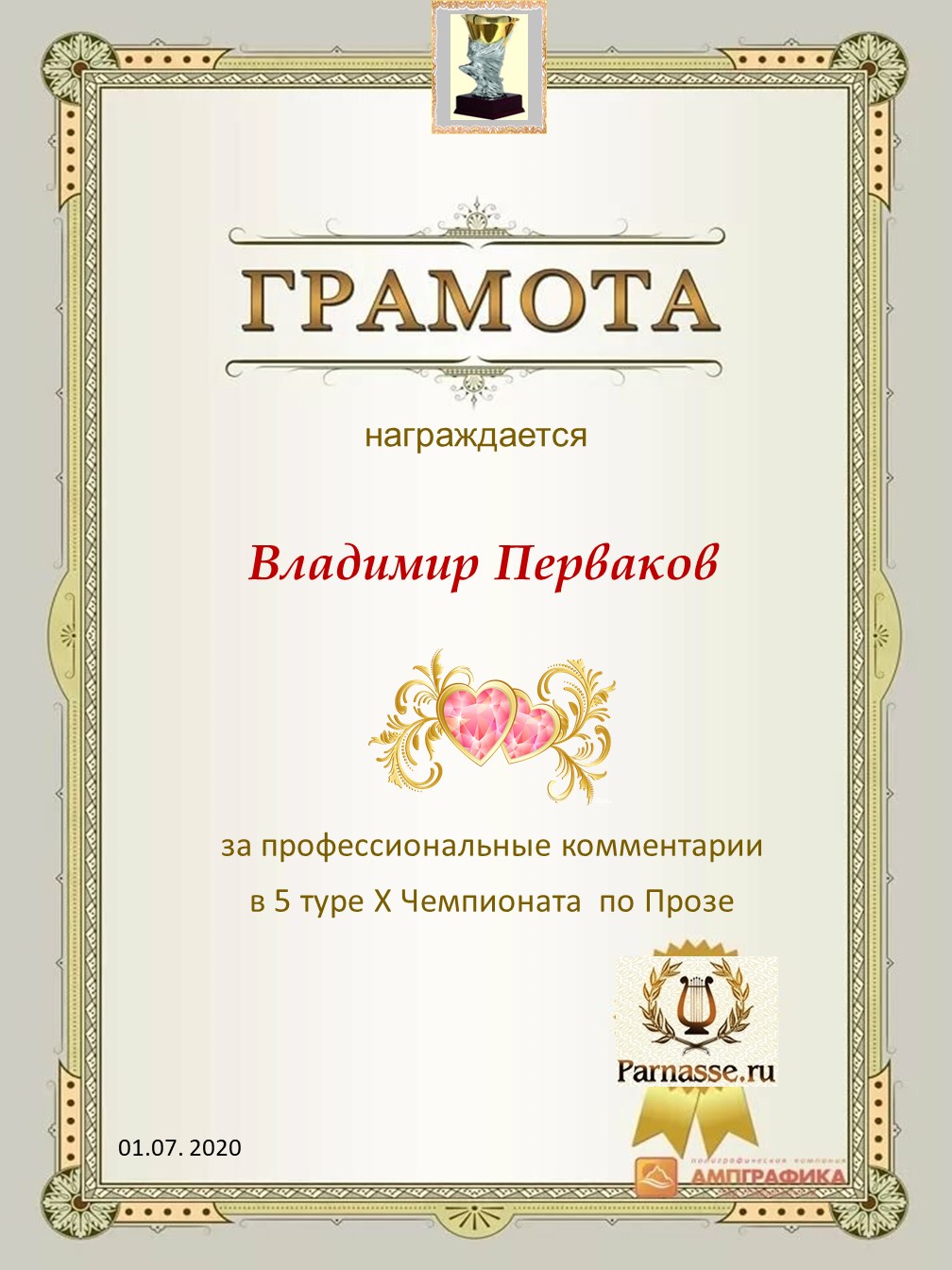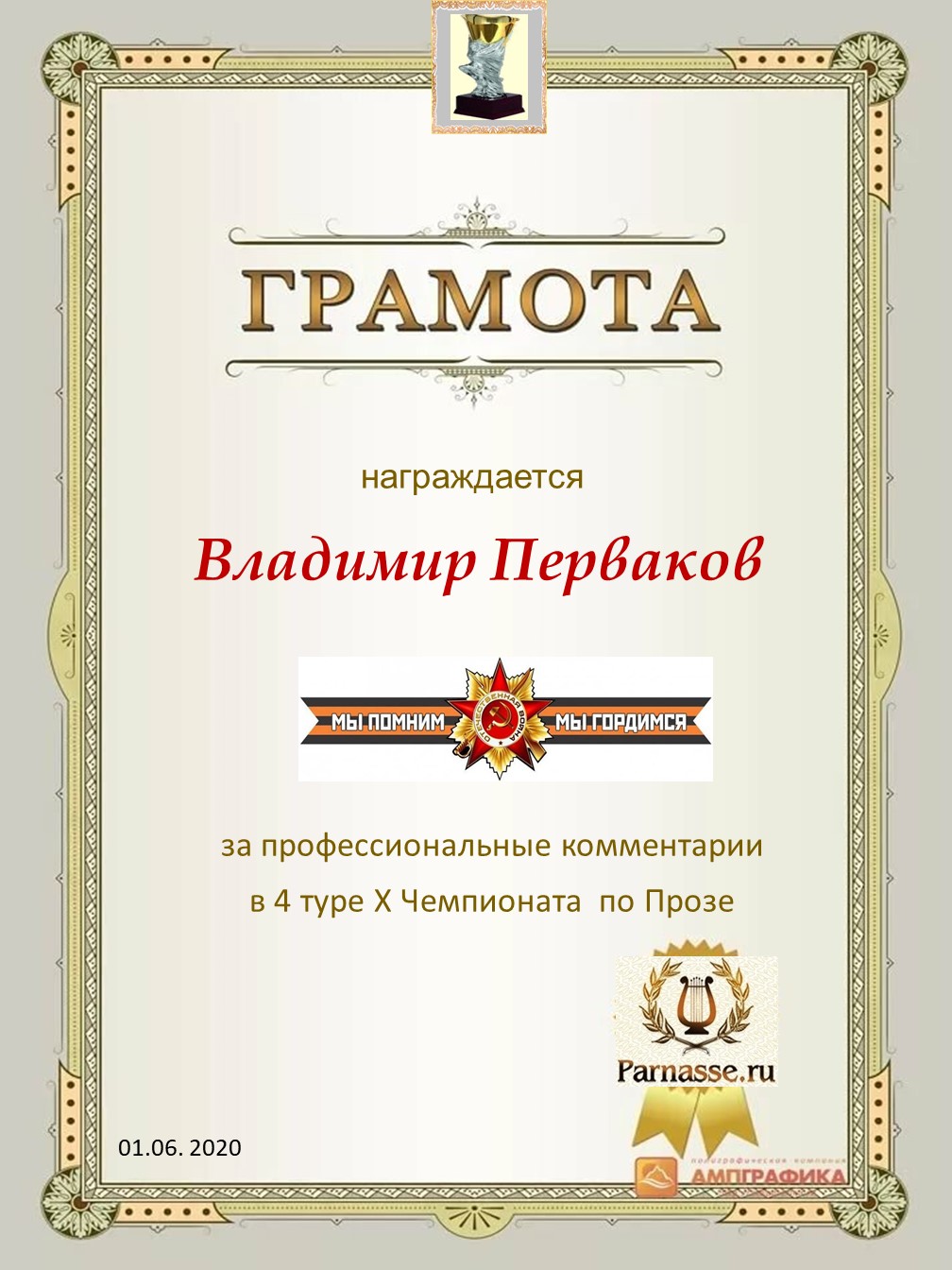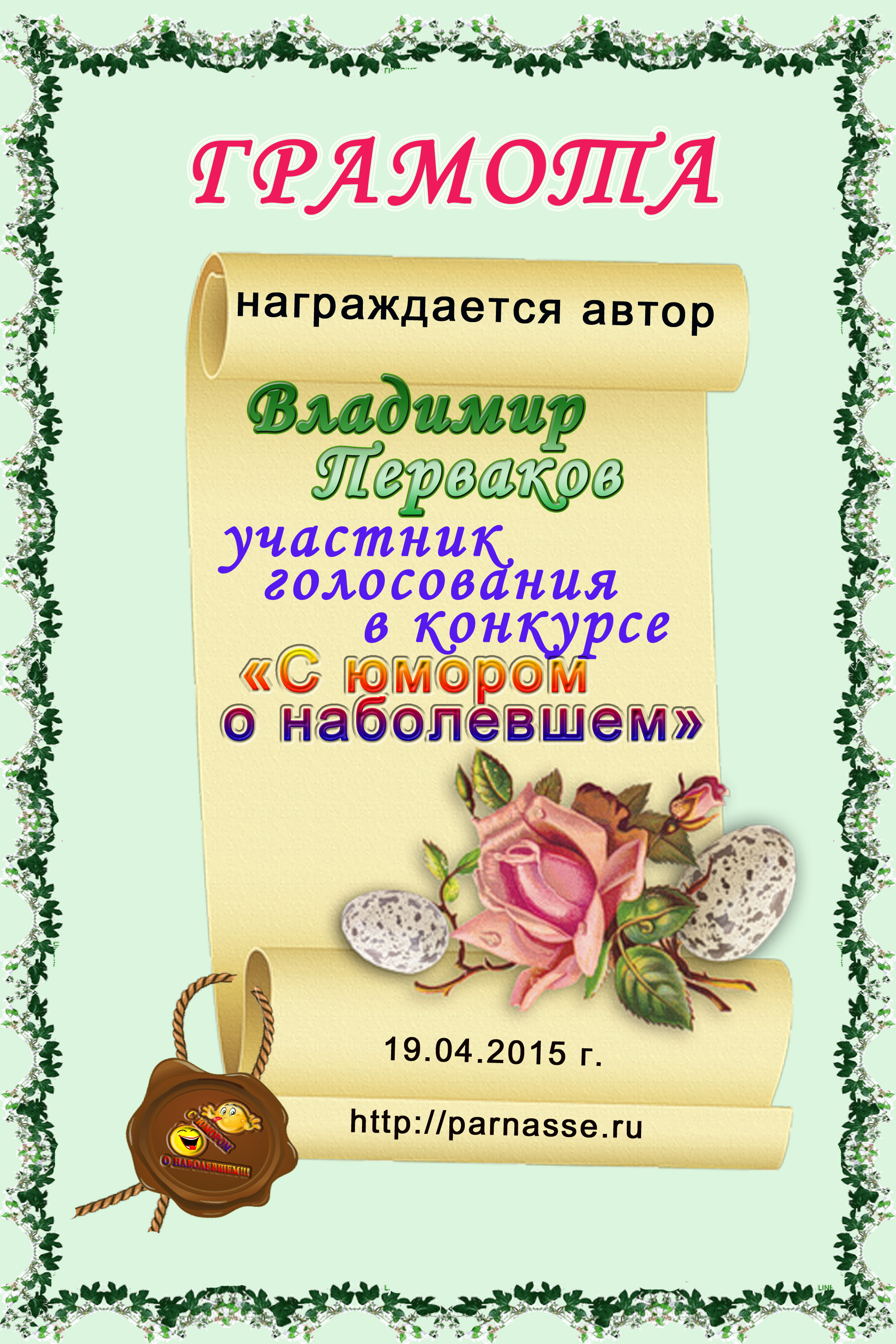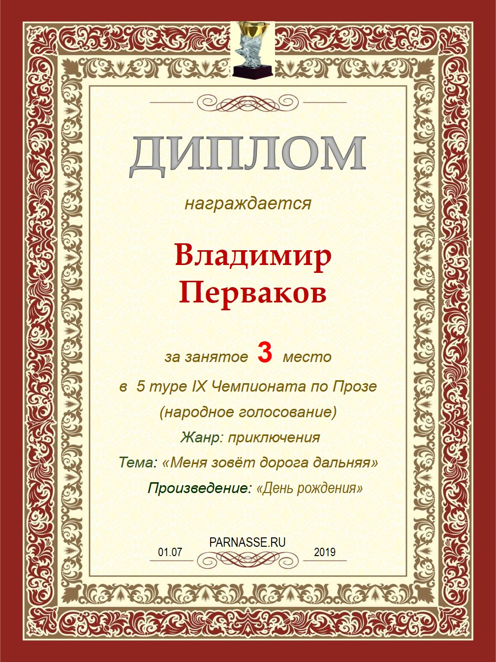 Диплом за 1 место в праздничном конкурсе "Поздравим Парнас с трёхлетием вместе!"
