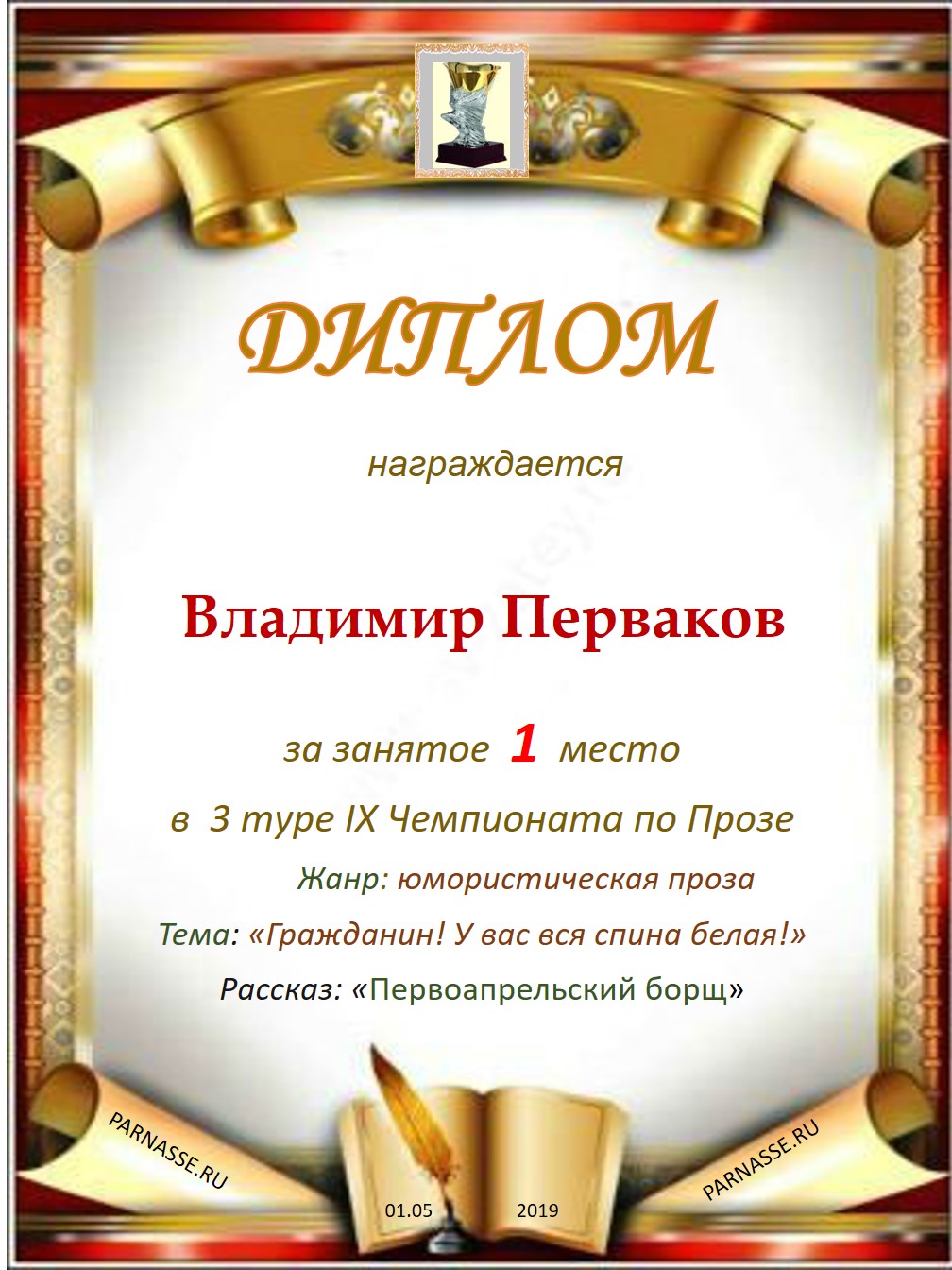 Поздравляю с занятым 1 местом в 3 туре IX Чемпионата по Прозе!