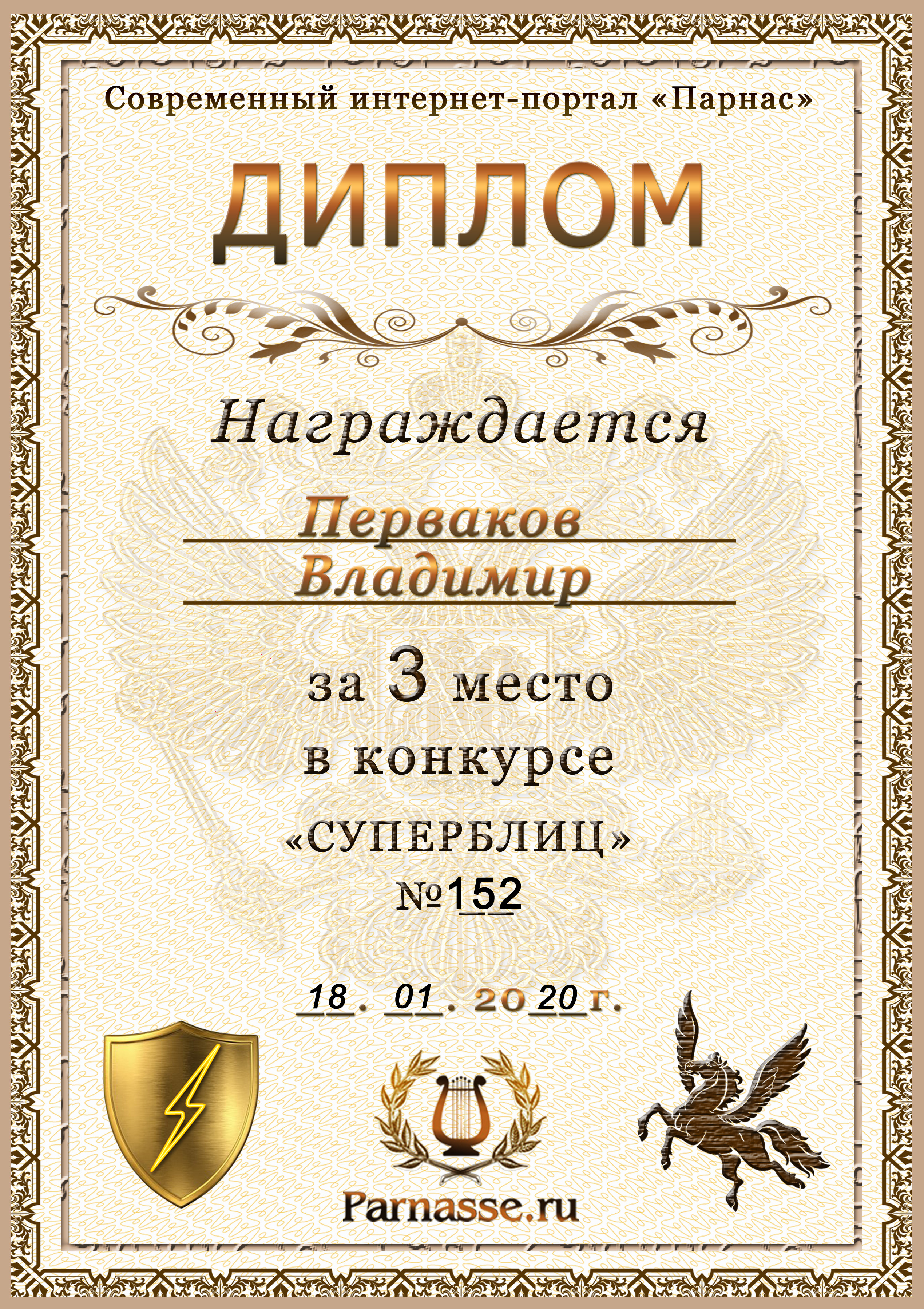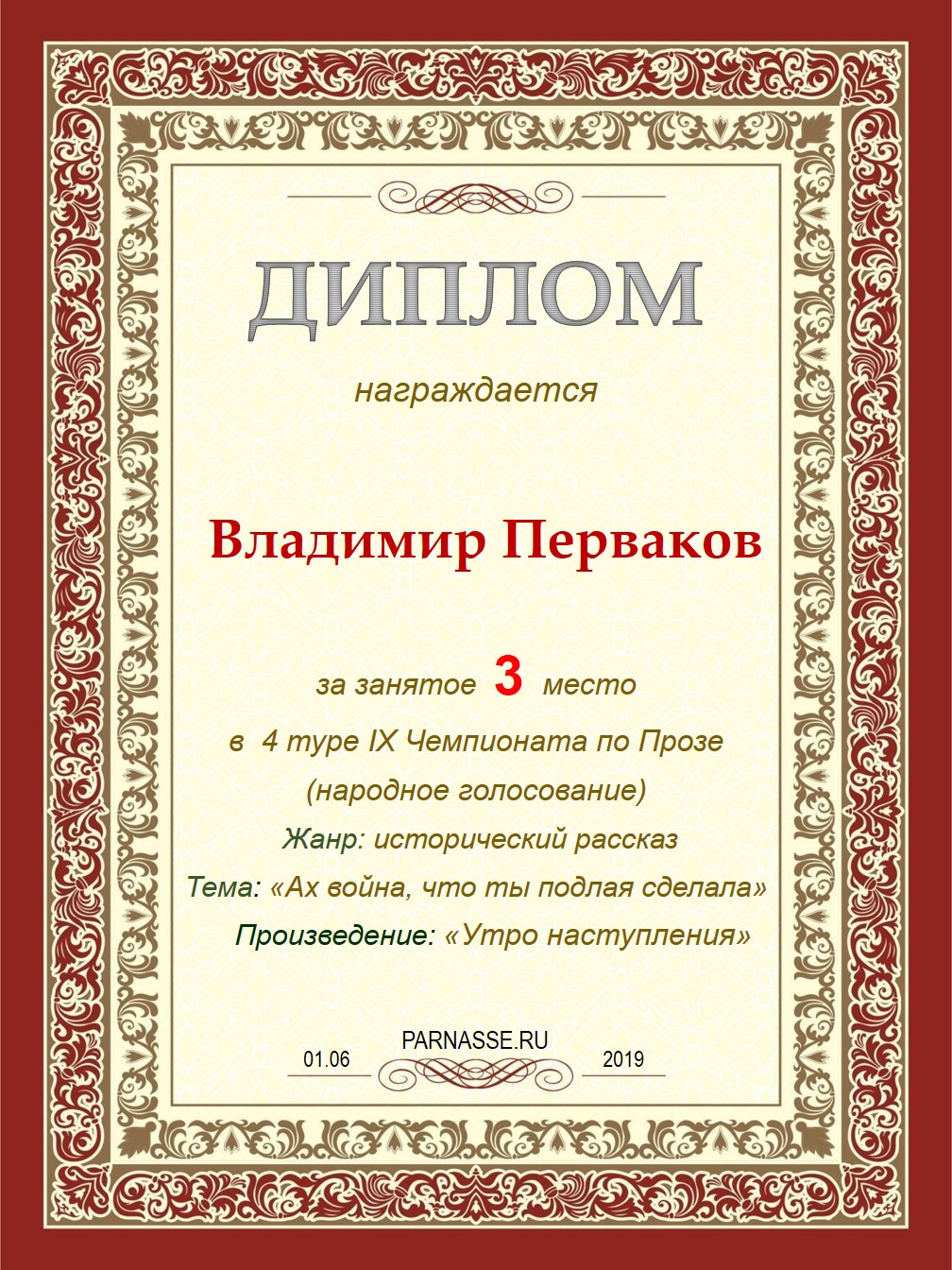 Диплом Победителя за 1 место в праздничном конкурсе "Поздравим Парнас с трёхлетием вместе!"