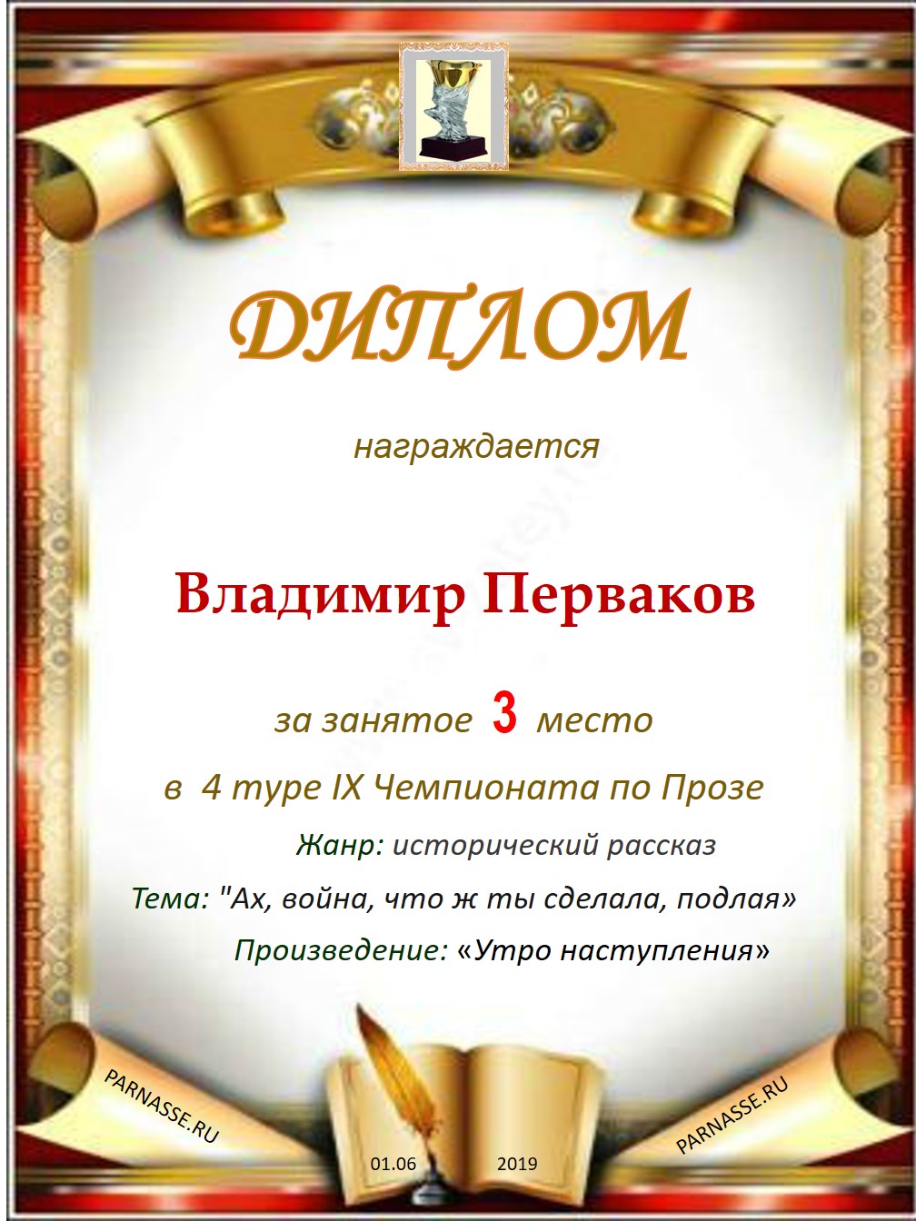 Поздравляю с занятым 3 местом в 4 туре IX Чемпионата Парнаса по Прозе - судейское голосование!