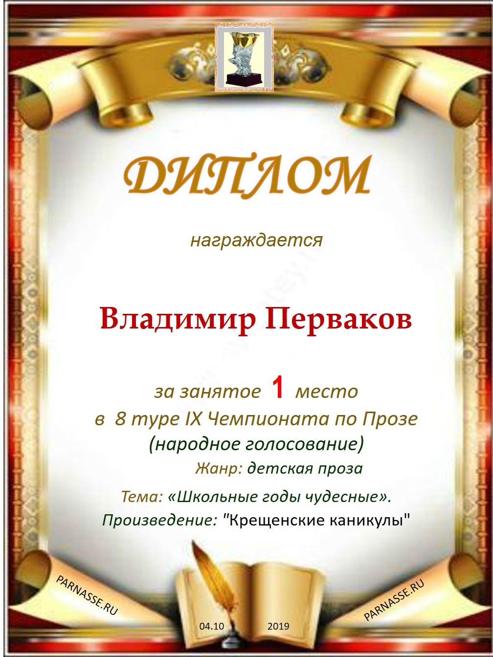 Поздравляю с занятым 1 местом в 8 туре IX Чемпионата Парнаса по Прозе (народное голосование)!