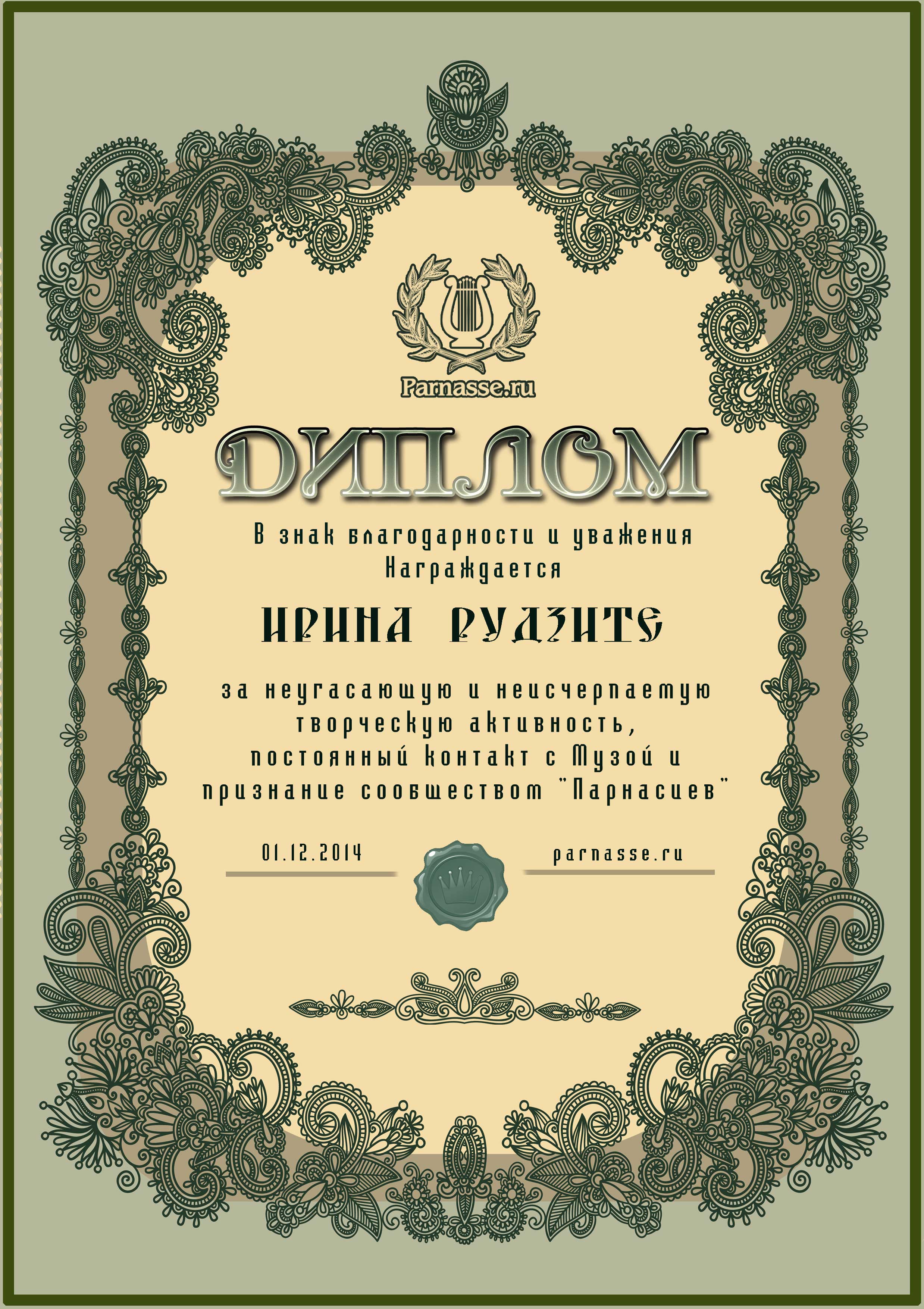 За неугасающую и неисчерпаемую творческую активность, постоянный контакт с Музой и признание сообществом "Парнасцев".От всей души желаем Вам, Ирина, здоровья, любви, успехов, благополучия, удачи и творческого вдохновения!