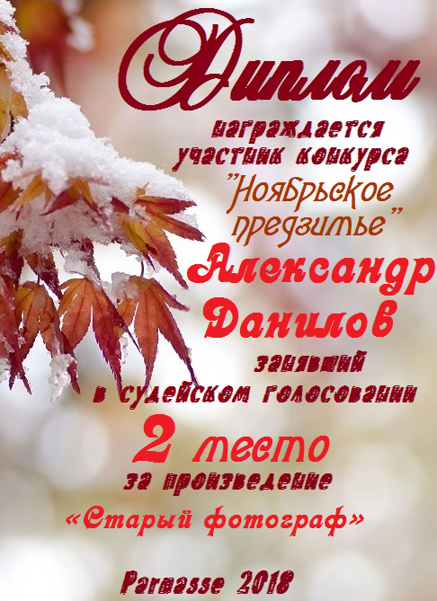 Второе место в ЛитКонкурсе "Литературный букет осеннего великолепия", в прозаической номинации " Ноябрьское предзимье", судейское голосование. Поздравляем с прекрасной победой!