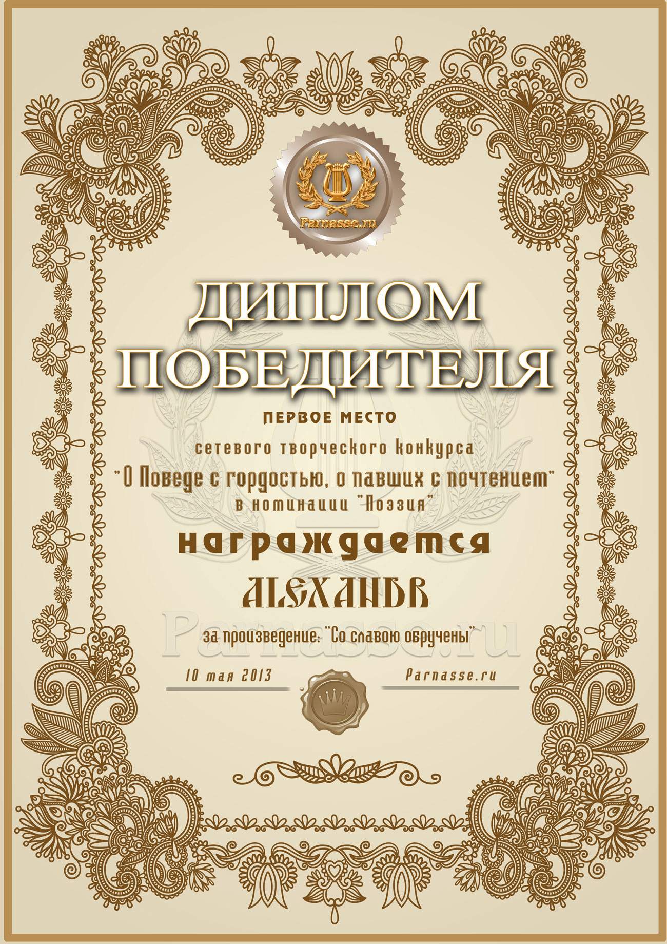 Первое место в музыкально-литературном конкурсе «О Победе с гордостью, о павших – с почтением!» Номинация в поэзии «Ваш Подвиг бессмертен»! Произведение «Cо славою обручены»! Поздравляем с заслуженной великолепной победой!