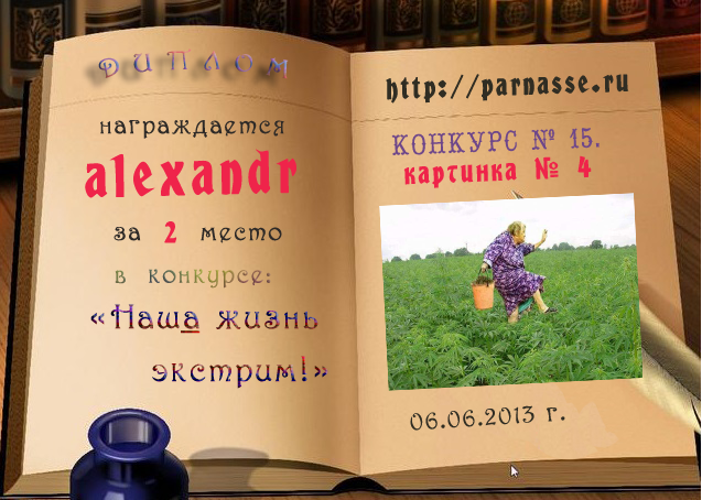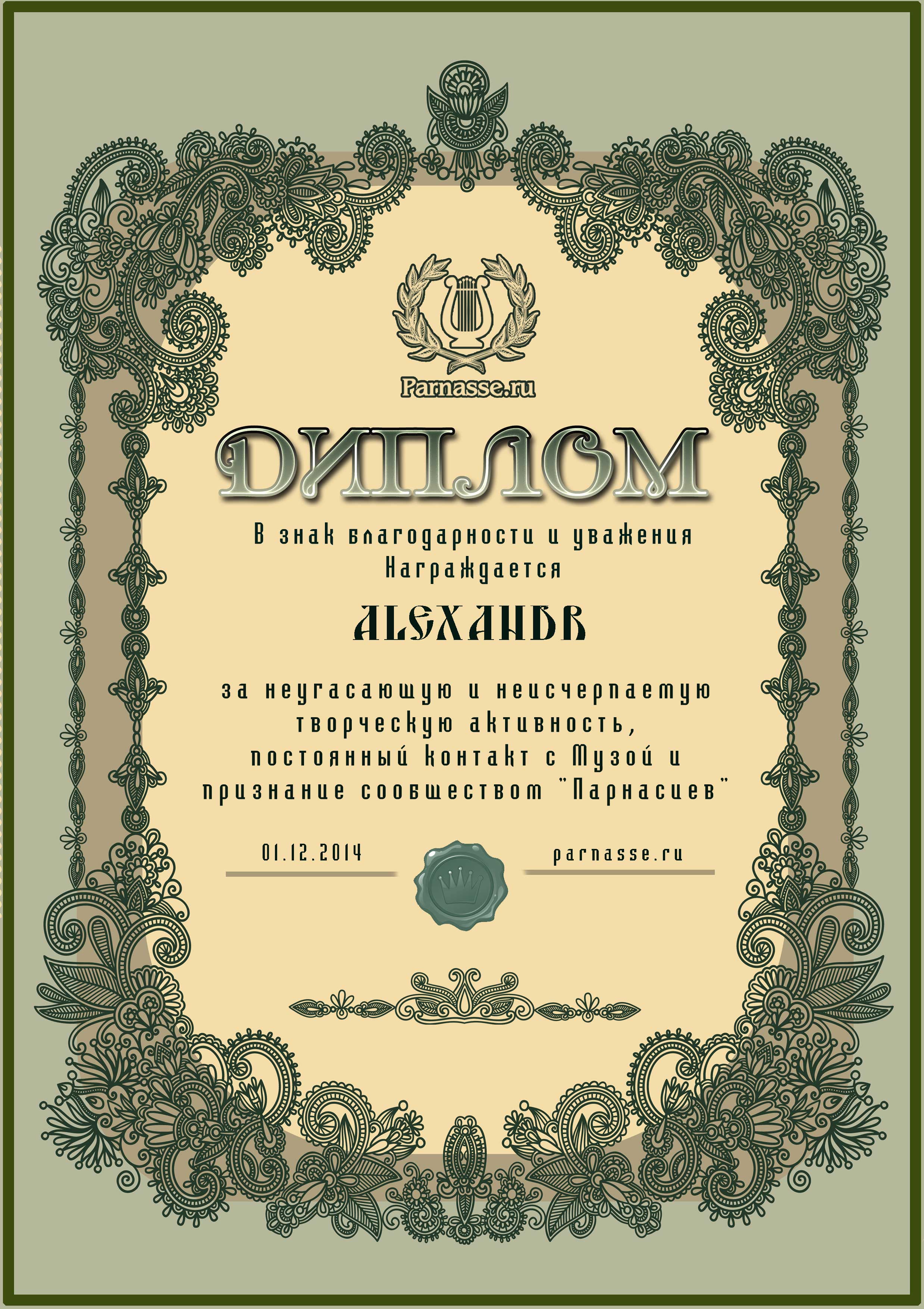 За неугасающую и неисчерпаемую творческую активность, постоянный контакт с Музой и признание сообществом "Парнасцев".От всей души желаем Вам, Александр, здоровья, любви, успехов, благополучия, удачи и творческого вдохновения!
