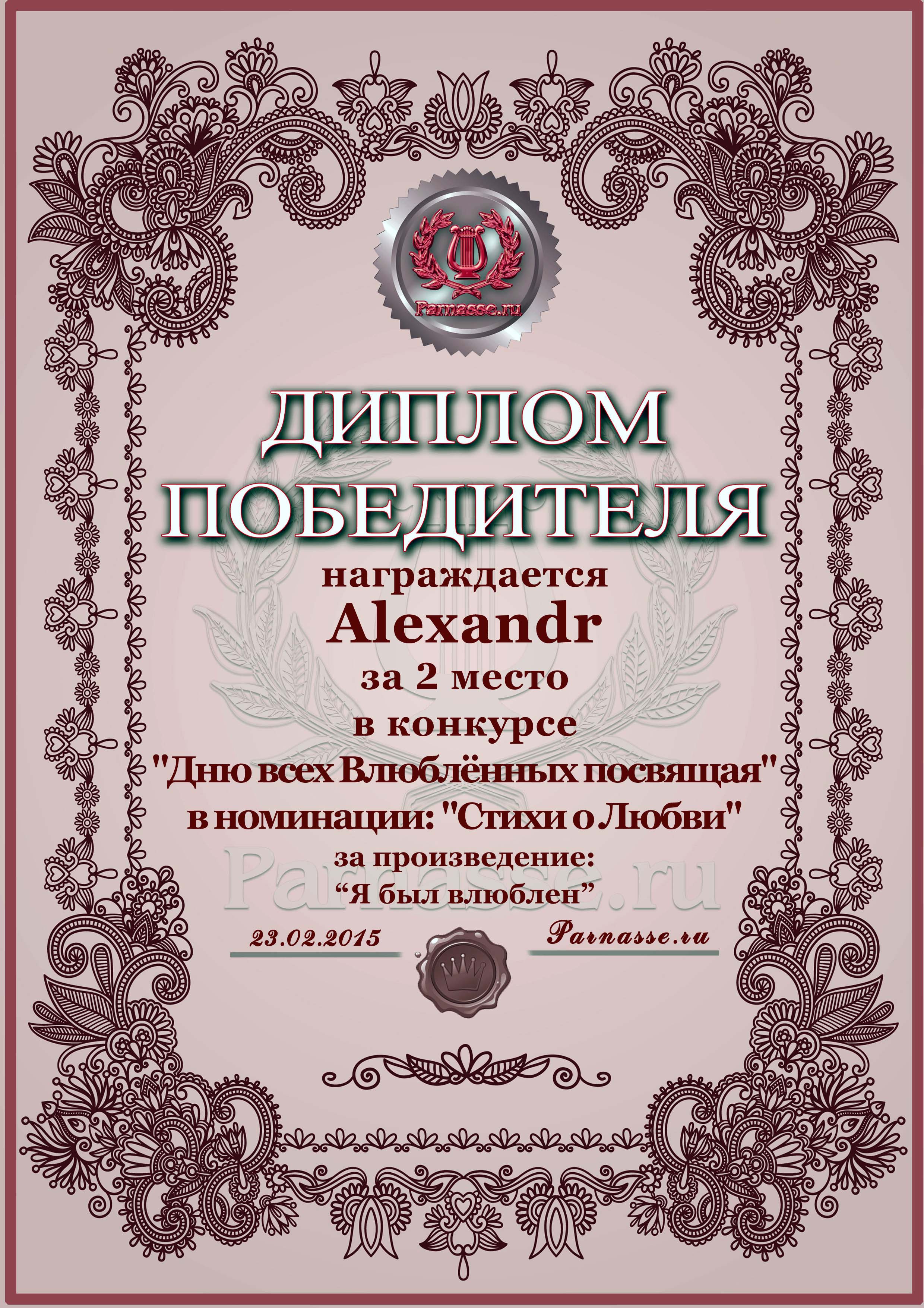 Второе место в конкурсе "Дню всех Влюблённых посвящая", поэтическая номинация, народное голосование, стихотворение "Я был влюблен". Поздравляем!