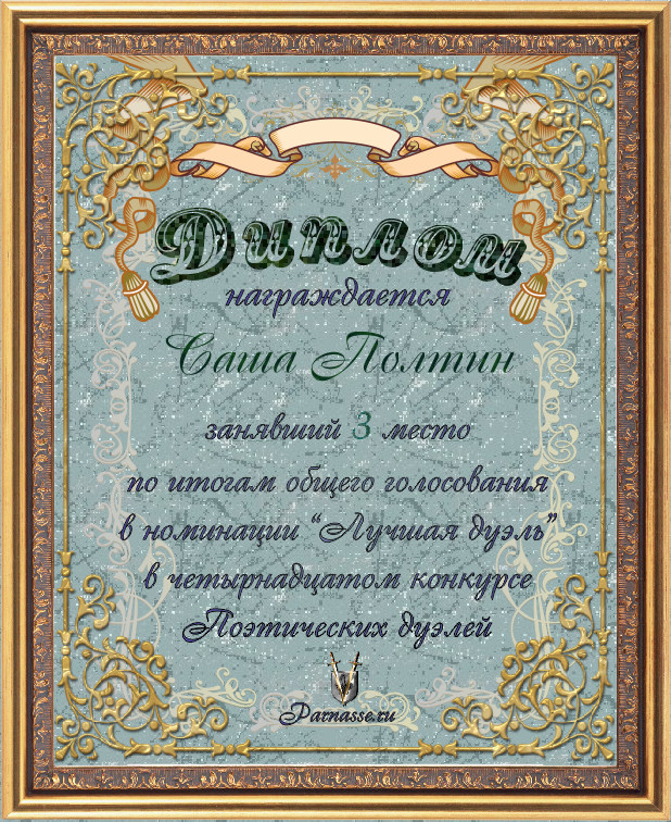 Диплом за 3-е место в номинации "ЛУЧШАЯ ДУЭЛЬ" по итогам общего голосования в 14ом конкурсе поэтических дуэлей (№ 12.4)