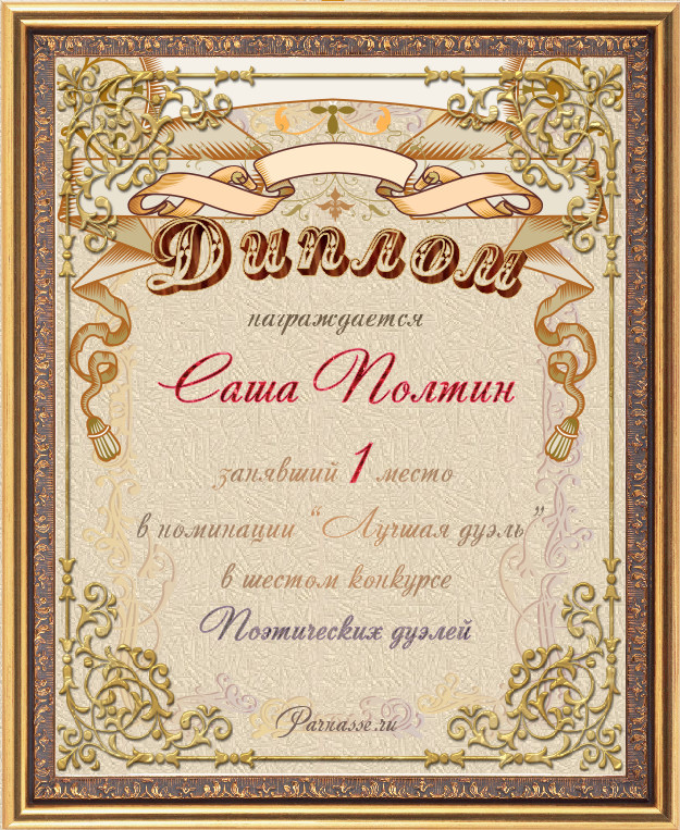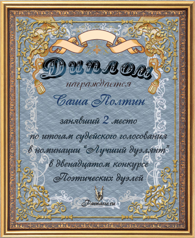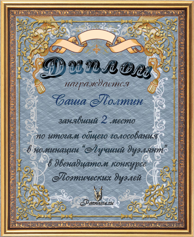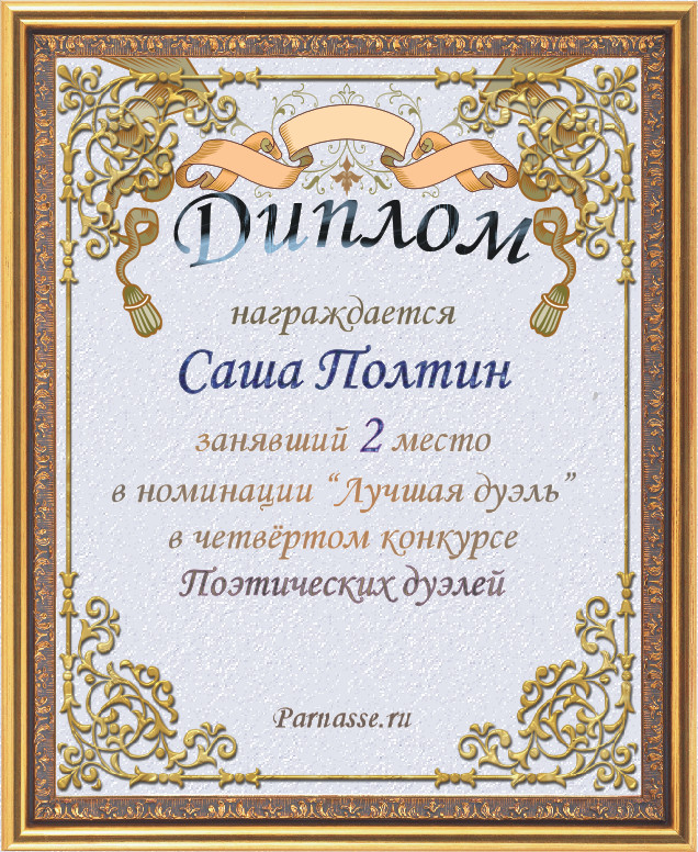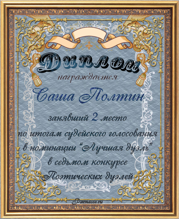 Диплом за 2-е место в номинации "Лучшая дуэль" по итогам судейского голосования в седьмом конкурсе поэтических дуэлей