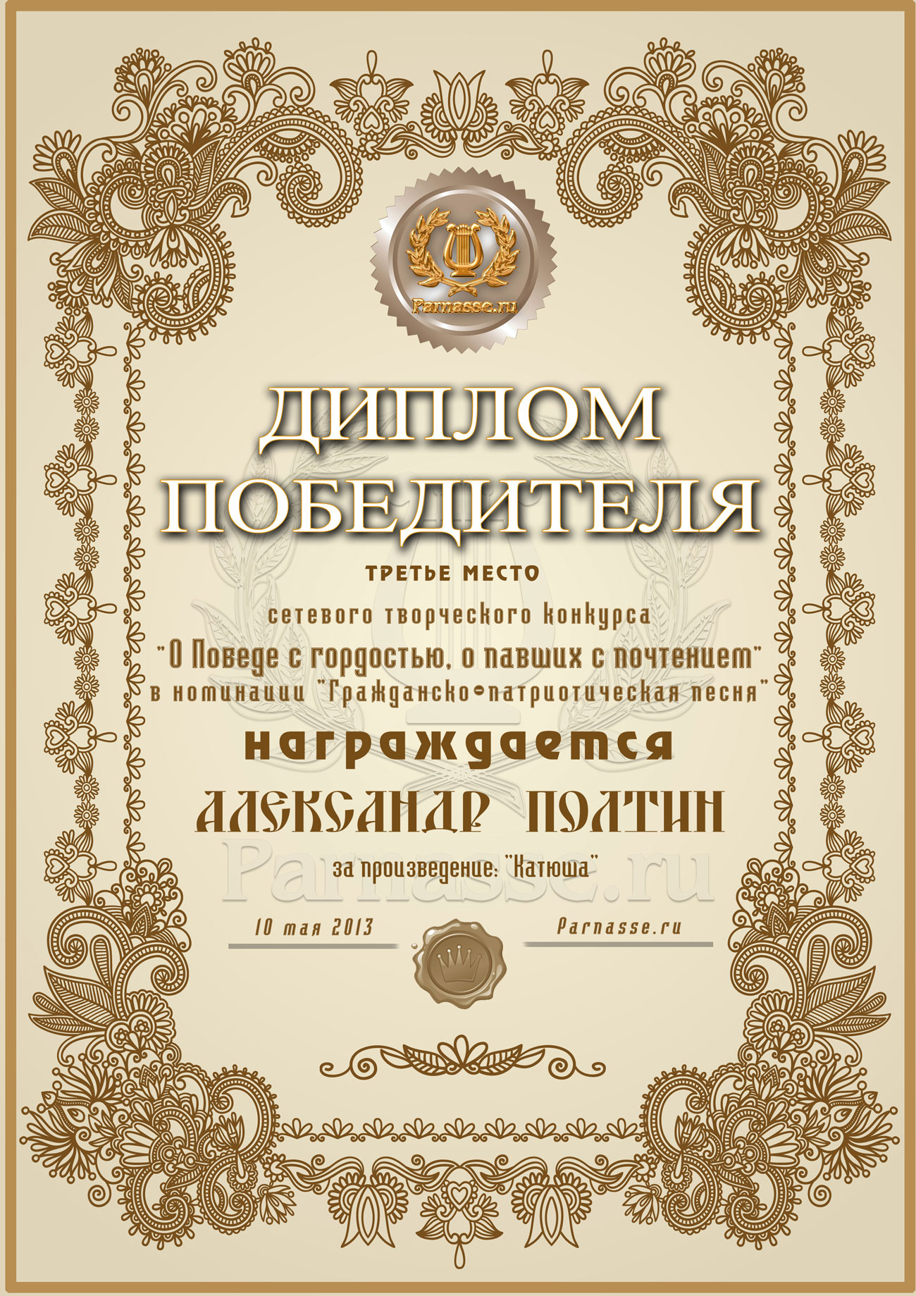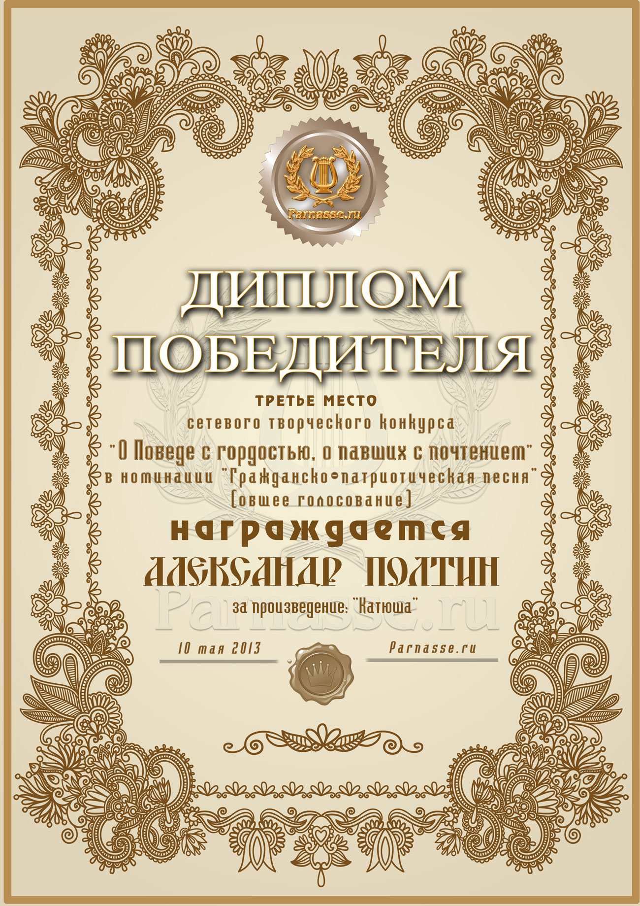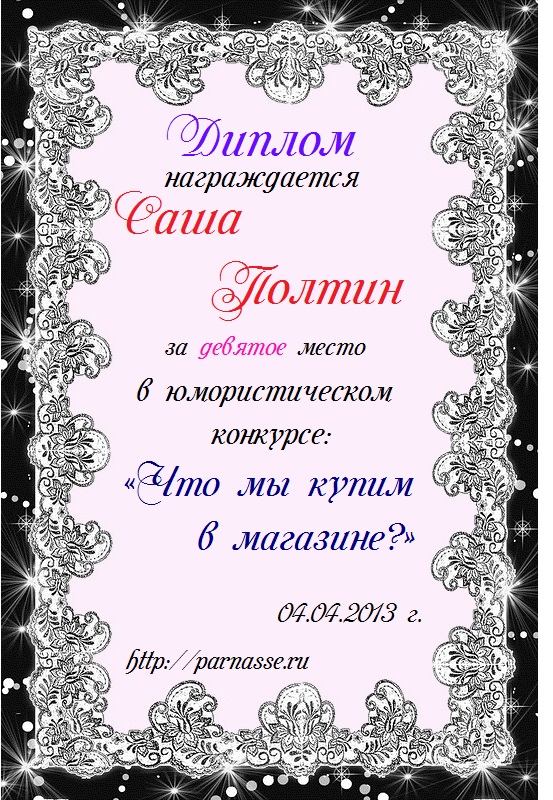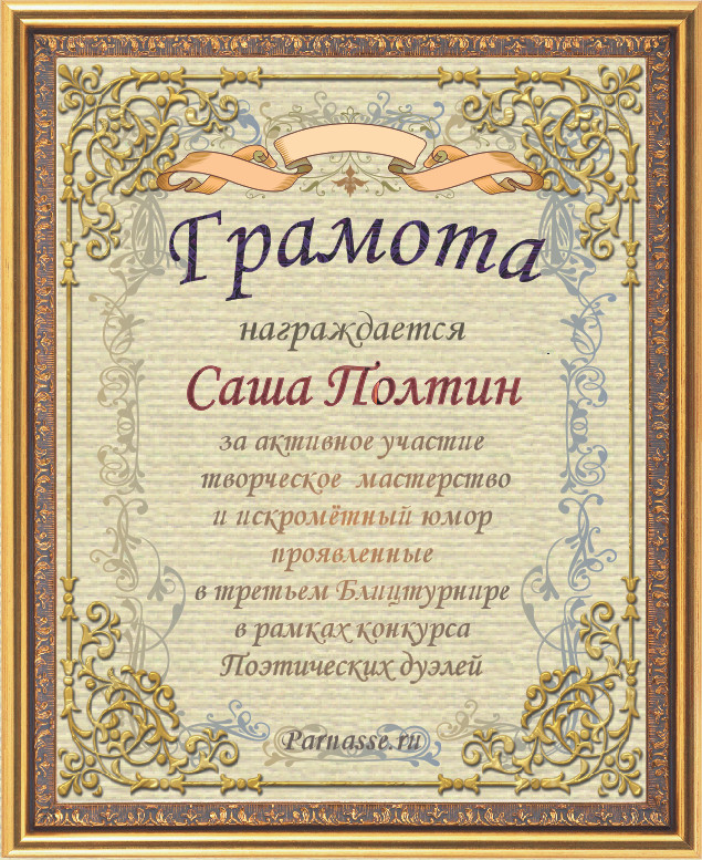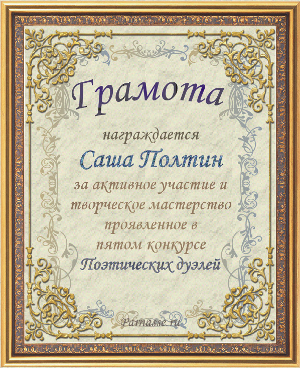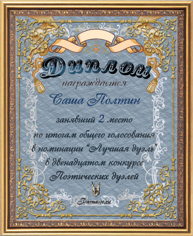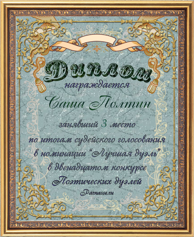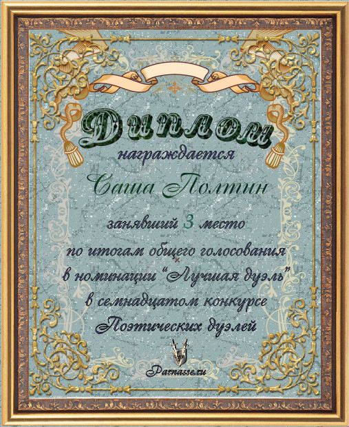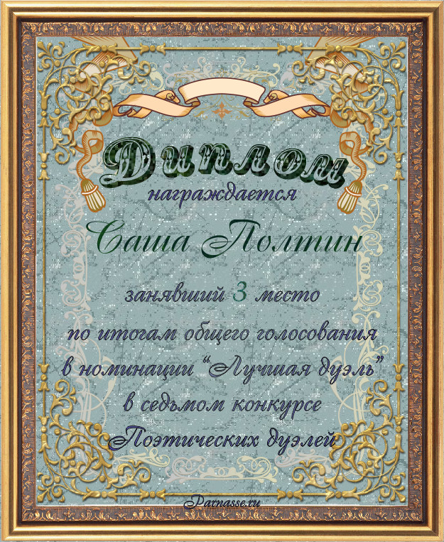 Диплом за 3-е место в номинации "Лучшая дуэль" по итогам общего голосования в седьмом конкурсе поэтических дуэлей (стр. 6)