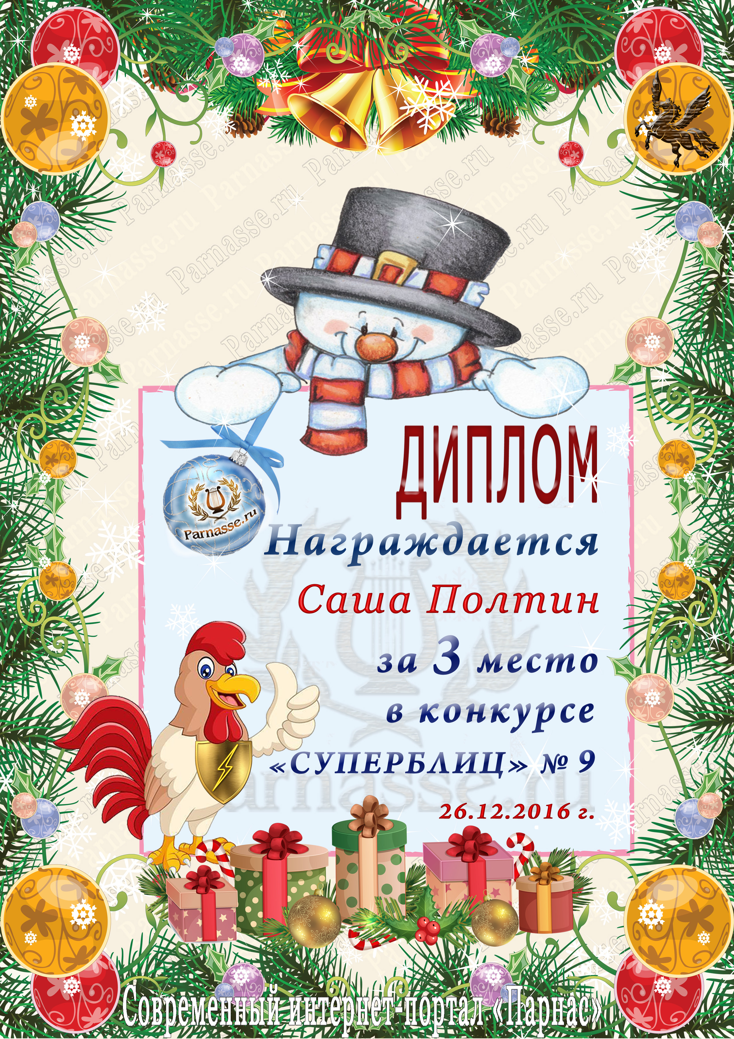 От лица Администрации творческого портала "Парнас" вручаем Вам этот памятный знак с самыми наилучшими пожеланиями! Пусть Вас весь год не покидает творческий запал, удача, а здоровье будет столь же крепким и нерушимым, как и традиция Новогоднего праздника! Счастья, успехов и любви Вам и Вашей семье, друзьям и близким!
