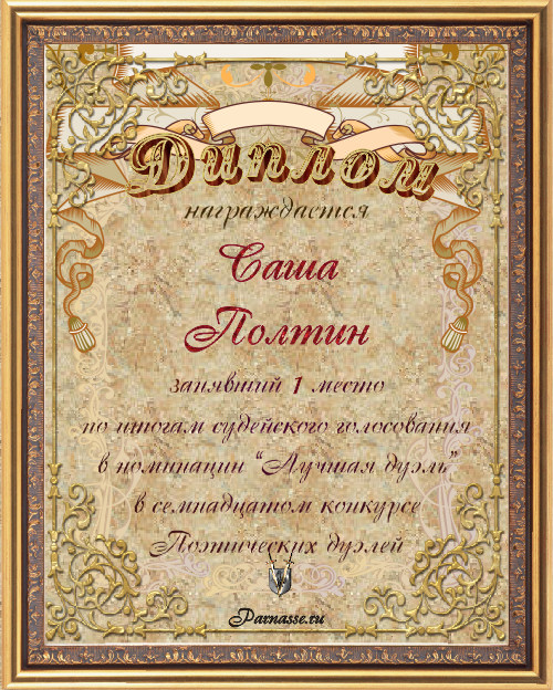 Диплом за 1-е место в номинации "Лучшая дуэль" по итогам судейского голосования в седьмом конкурсе поэтических дуэлей
