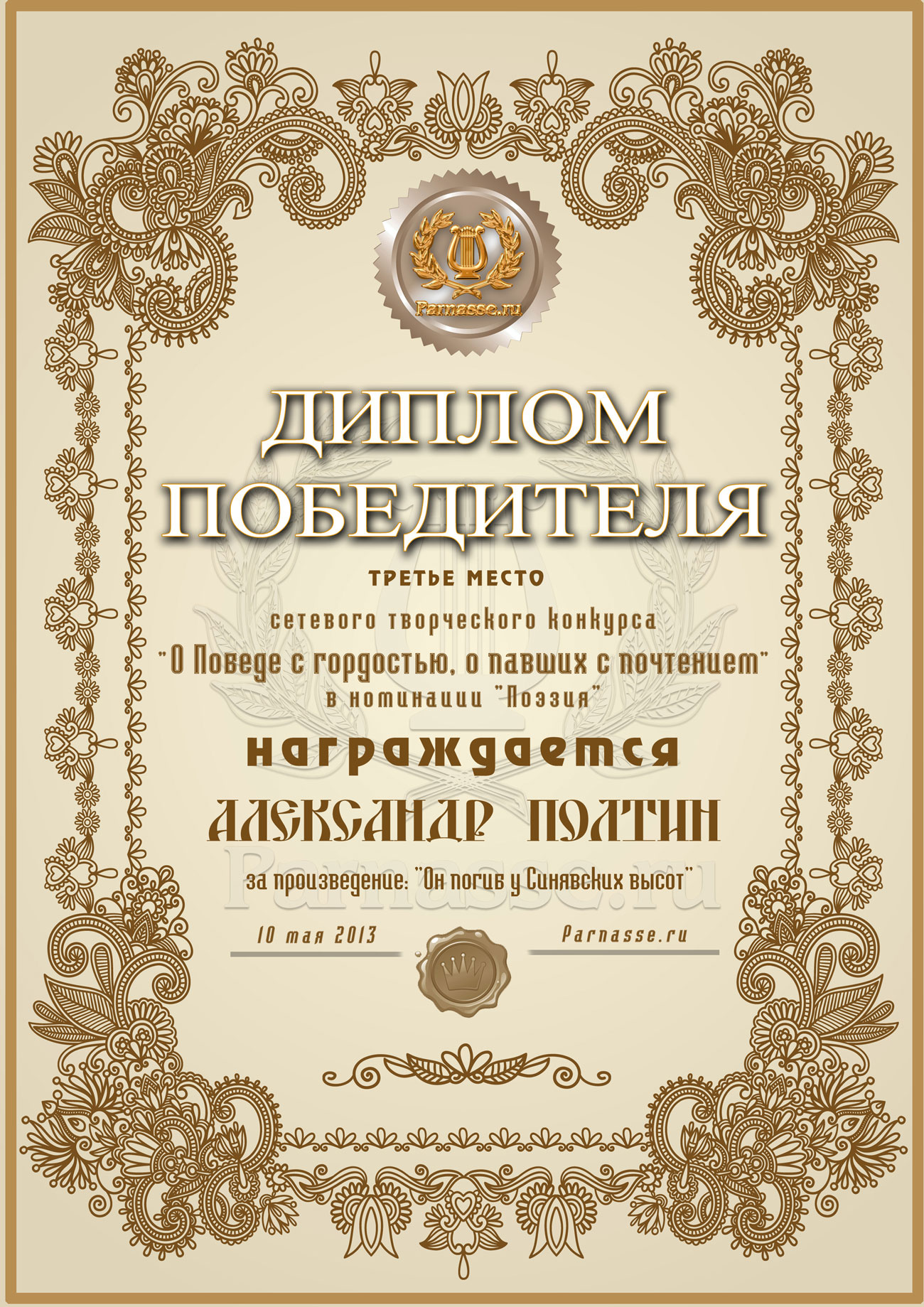 Третье место в конкурсе "О Победе с гордостью, о павших с почтением" (За произведение "Он погиб у Синявских высот")