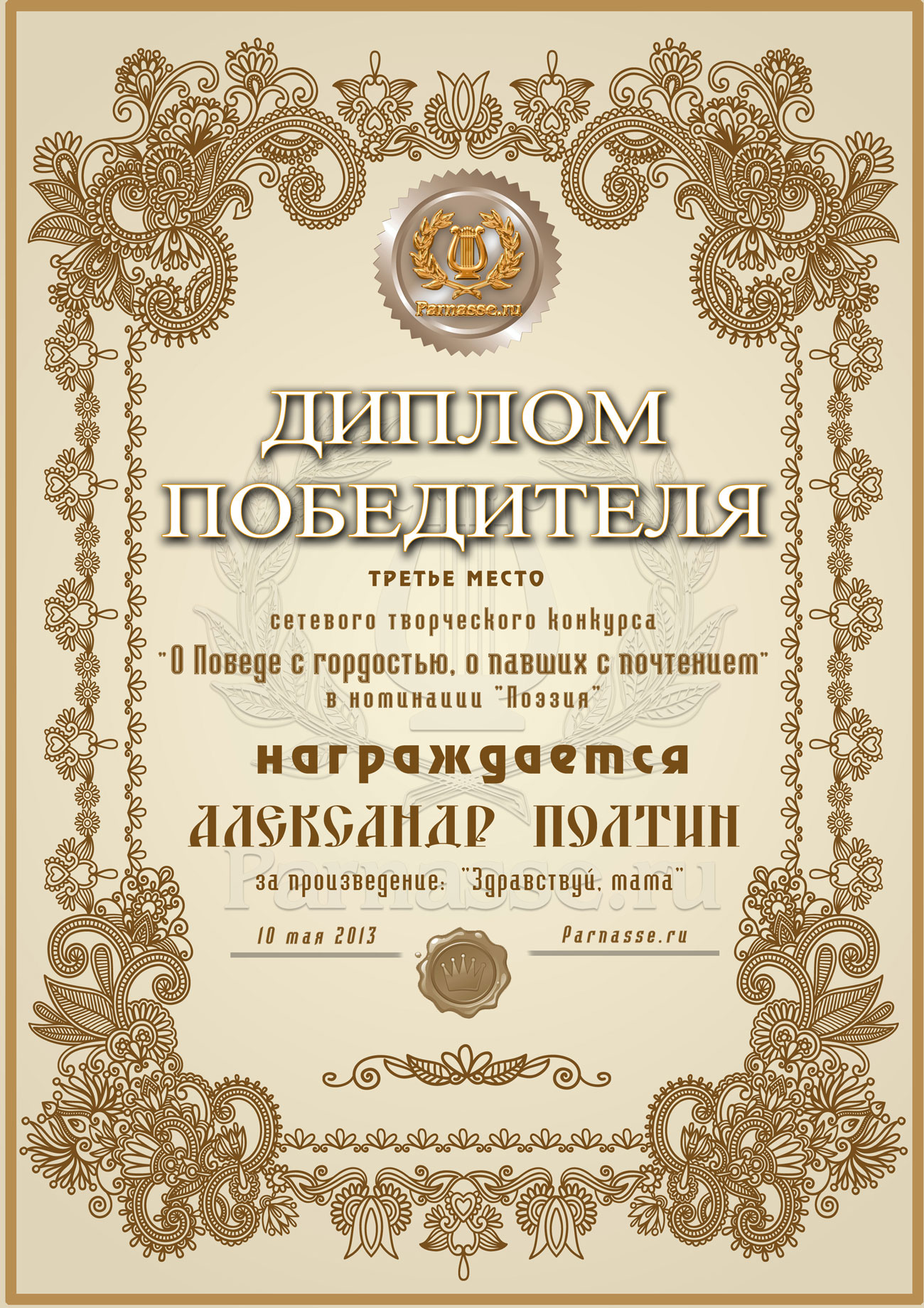 Третье место в конкурсе "О Победе с гордостью, о павших с почтением" (За произведение "Здравствуй, мама")