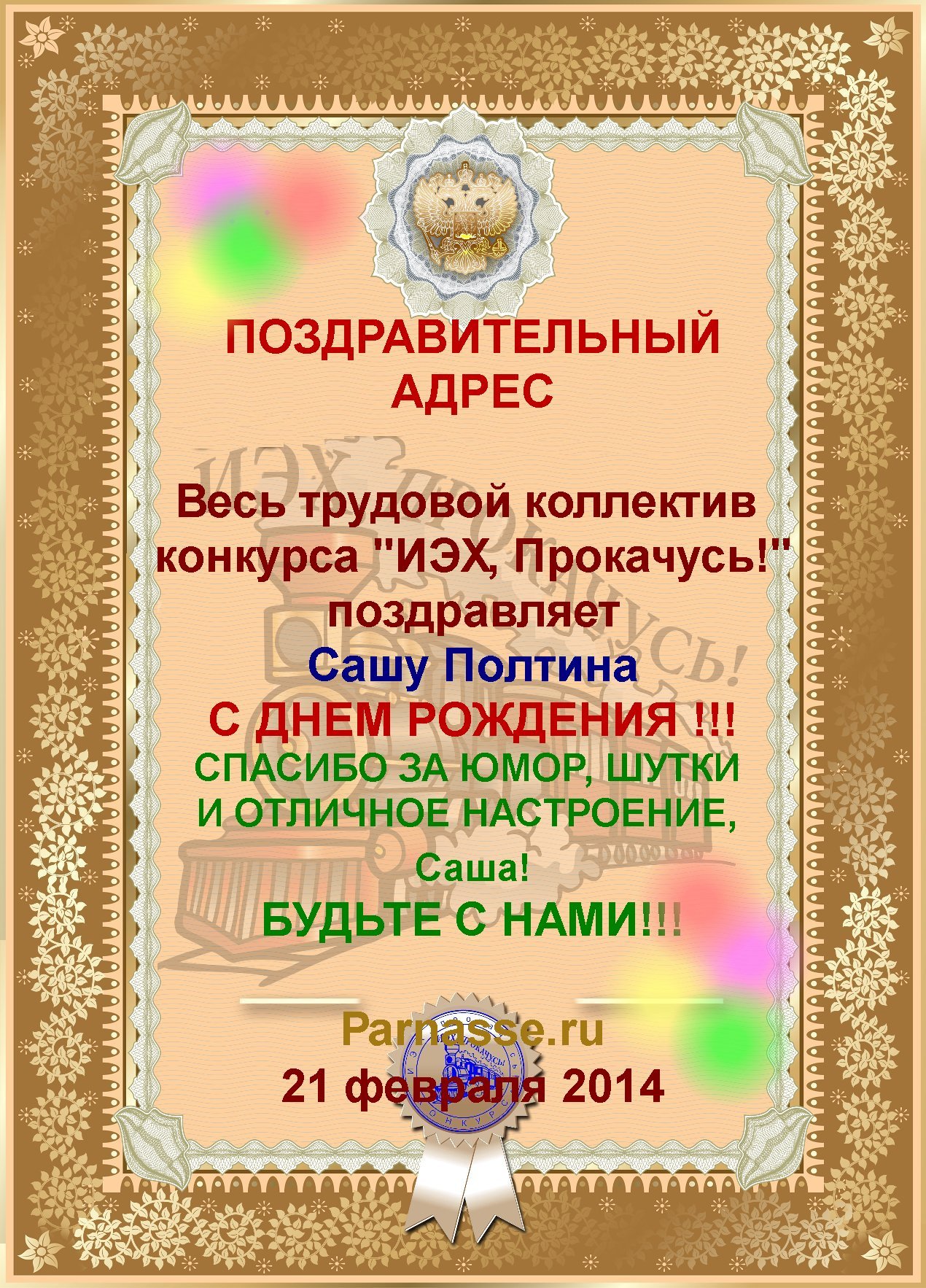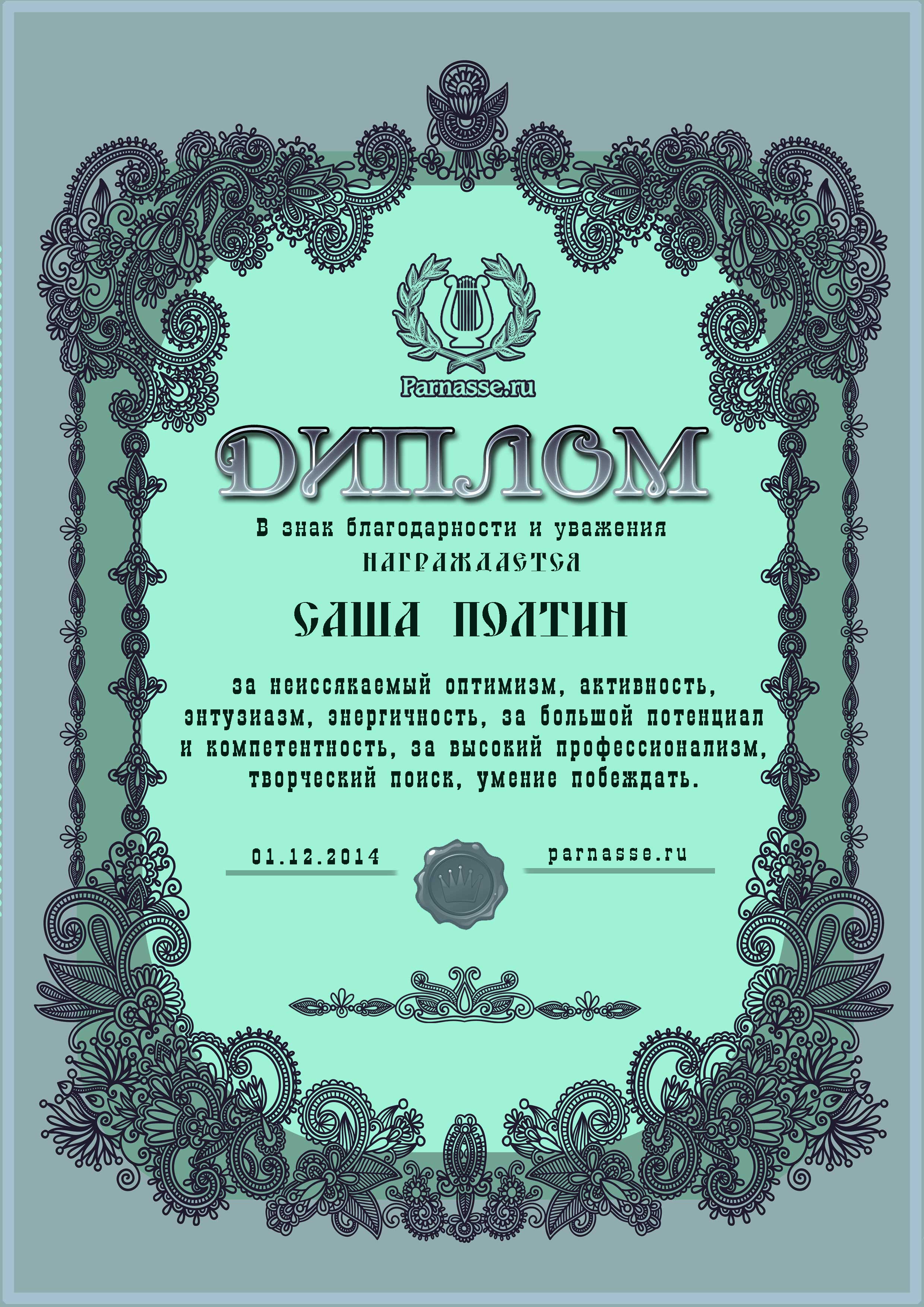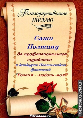 За неугасающую и неисчерпаемую творческую активность, постоянный контакт с Музой и признание сообществом "Парнасцев".От всей души желаем Вам, Саша, здоровья, любви, успехов, благополучия, удачи и творческого вдохновения!