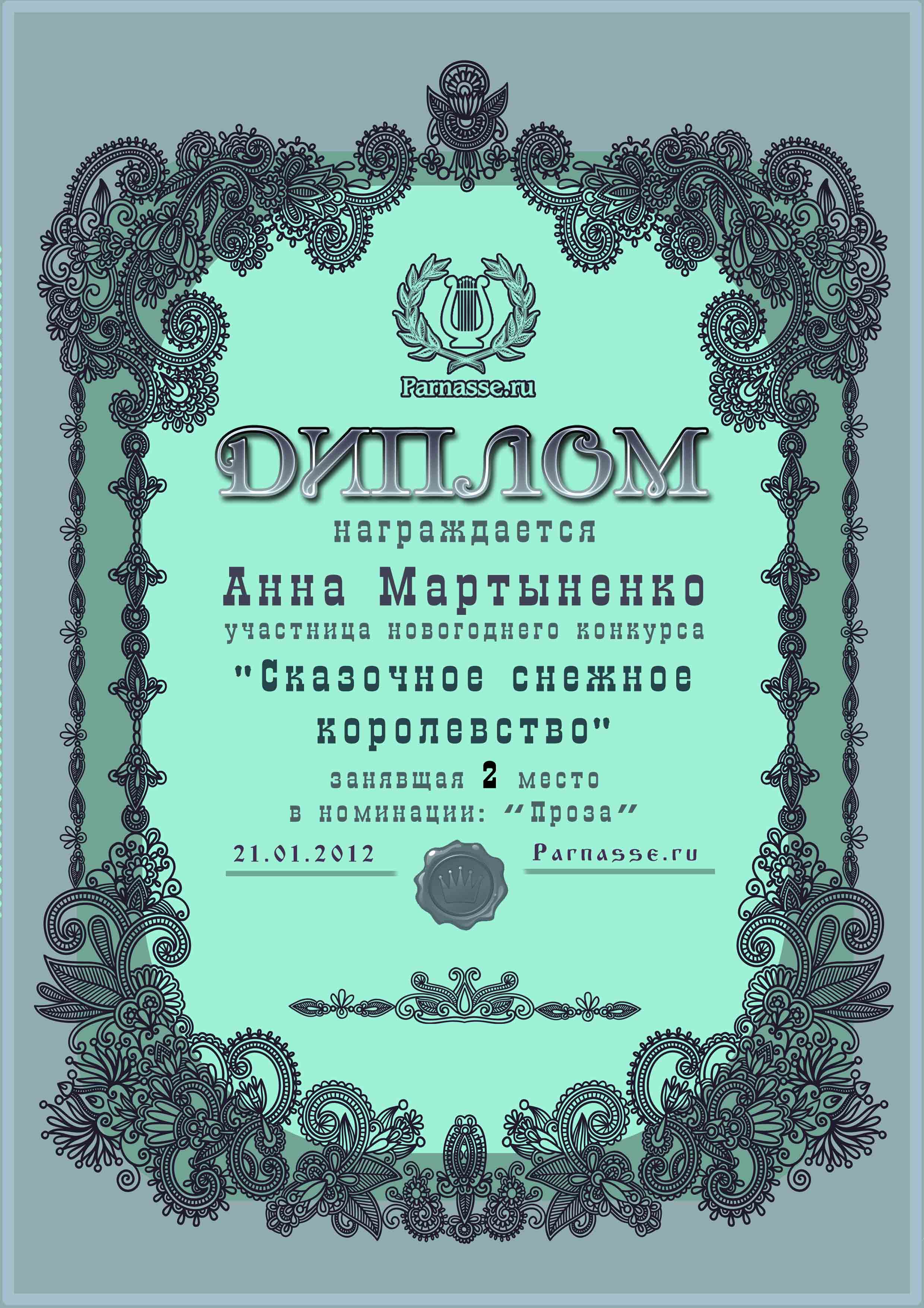 Диплом за 2 место в конкурсе "Сказочное снежное королевство!"