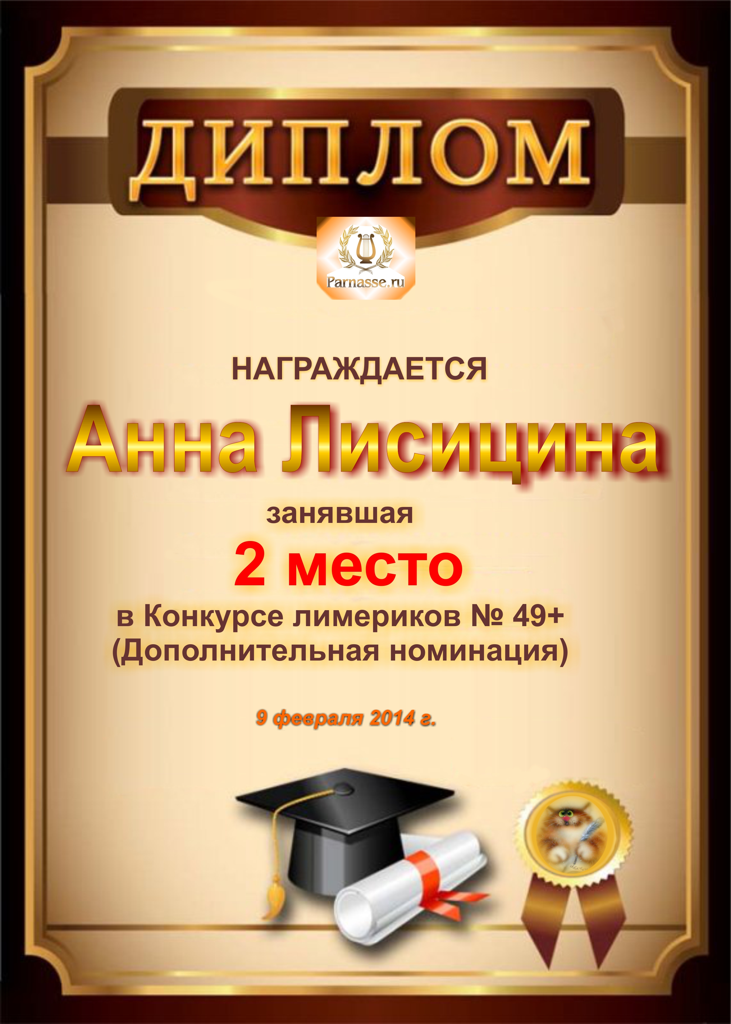 Диплом за победу и 2 место в дополнительной номинации конкурса лимериков № 49+ (9.02.2014г.)