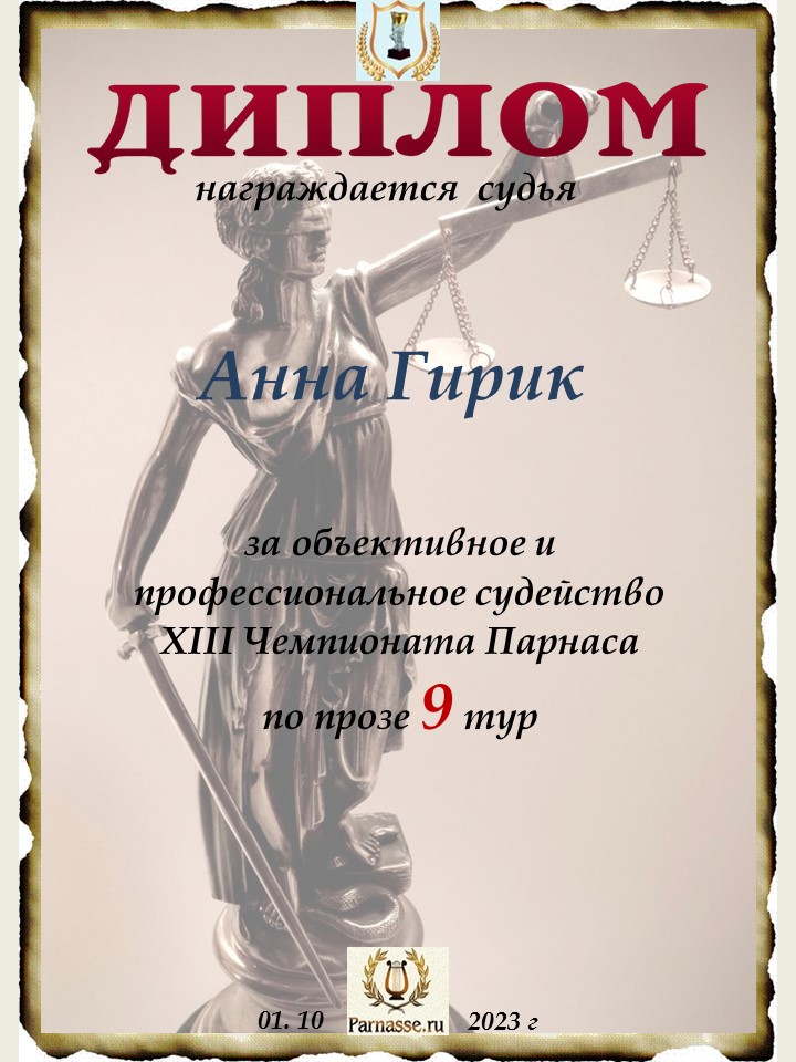 ![]() Медаль судьи в 9 туре XIII Чемпионата Парнаса по прозе