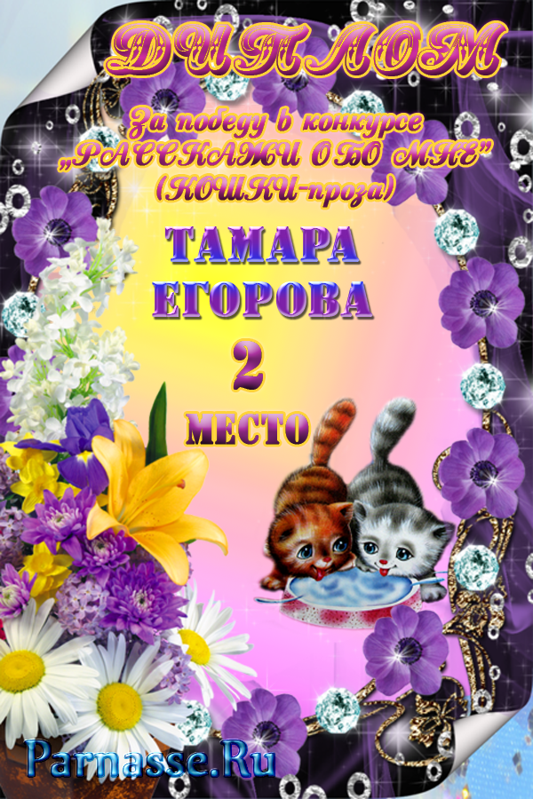 Победителю музыкально-литературного конкурса "Ах, Мама, Мамочка, родная!" Номинация "Рассказы-сказки о Мамочке". Поздравляем! Счастья Вам и всего замечательного. Желаем хорошего настроения, вдохновения и удачи во всем. Спасибо за участие в конкурсе. С Уважением, Администрация.