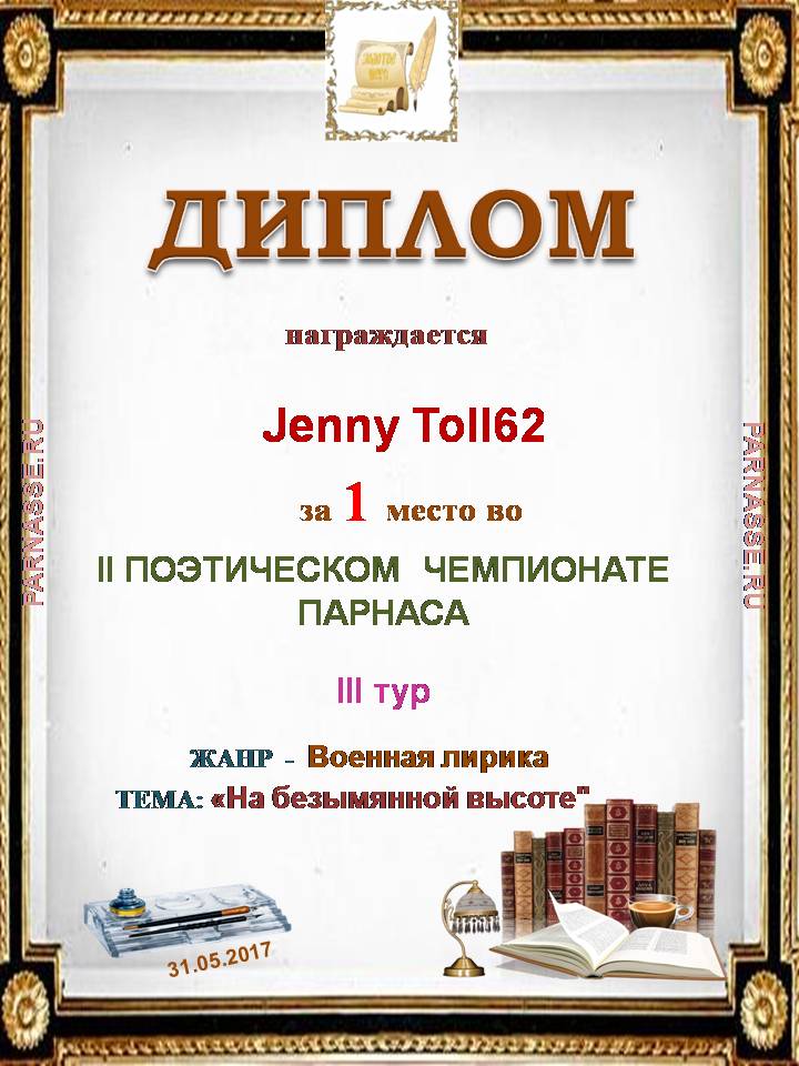 За 1 место в третьем туре II Чемпионата поэзии, жанр - военная лирика, тема "На безымянной высоте"