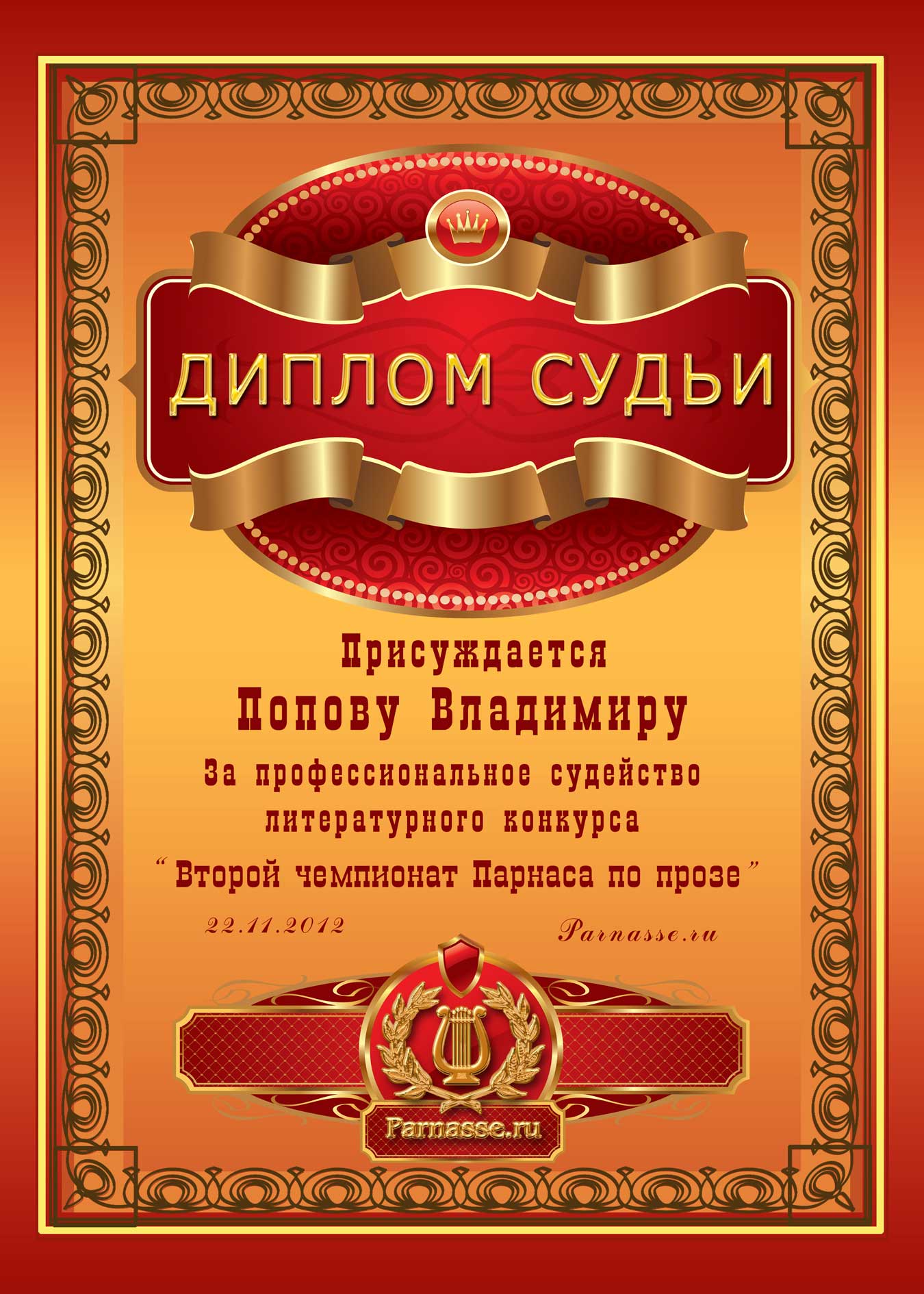 Диплом судьи Второго чемпионата Парнаса по прозе.