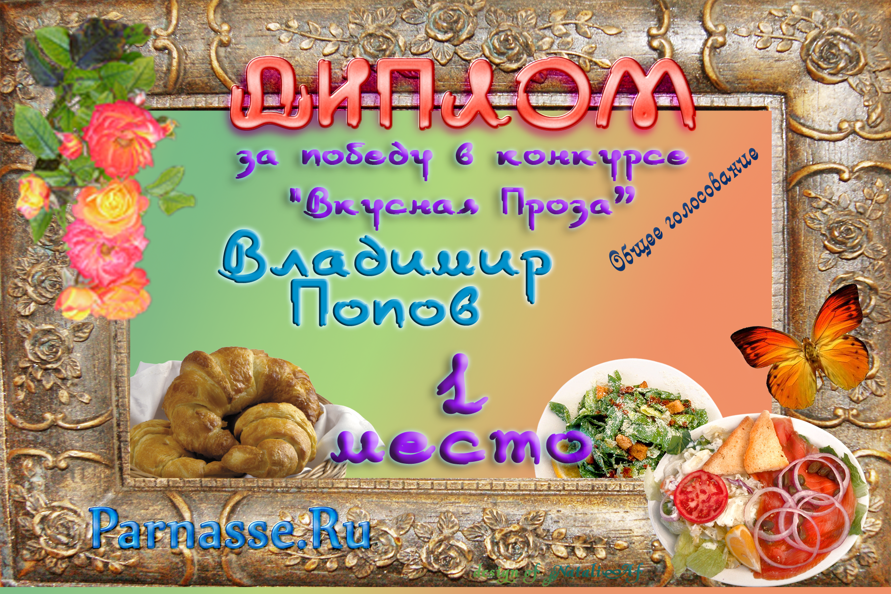 Уважаемый Владимир!От всего сердца поздравляем Вас с блестящей ПОБЕДОЙ в номинации «Вкусная ПРОЗА», во "Вкусном конкурсе"