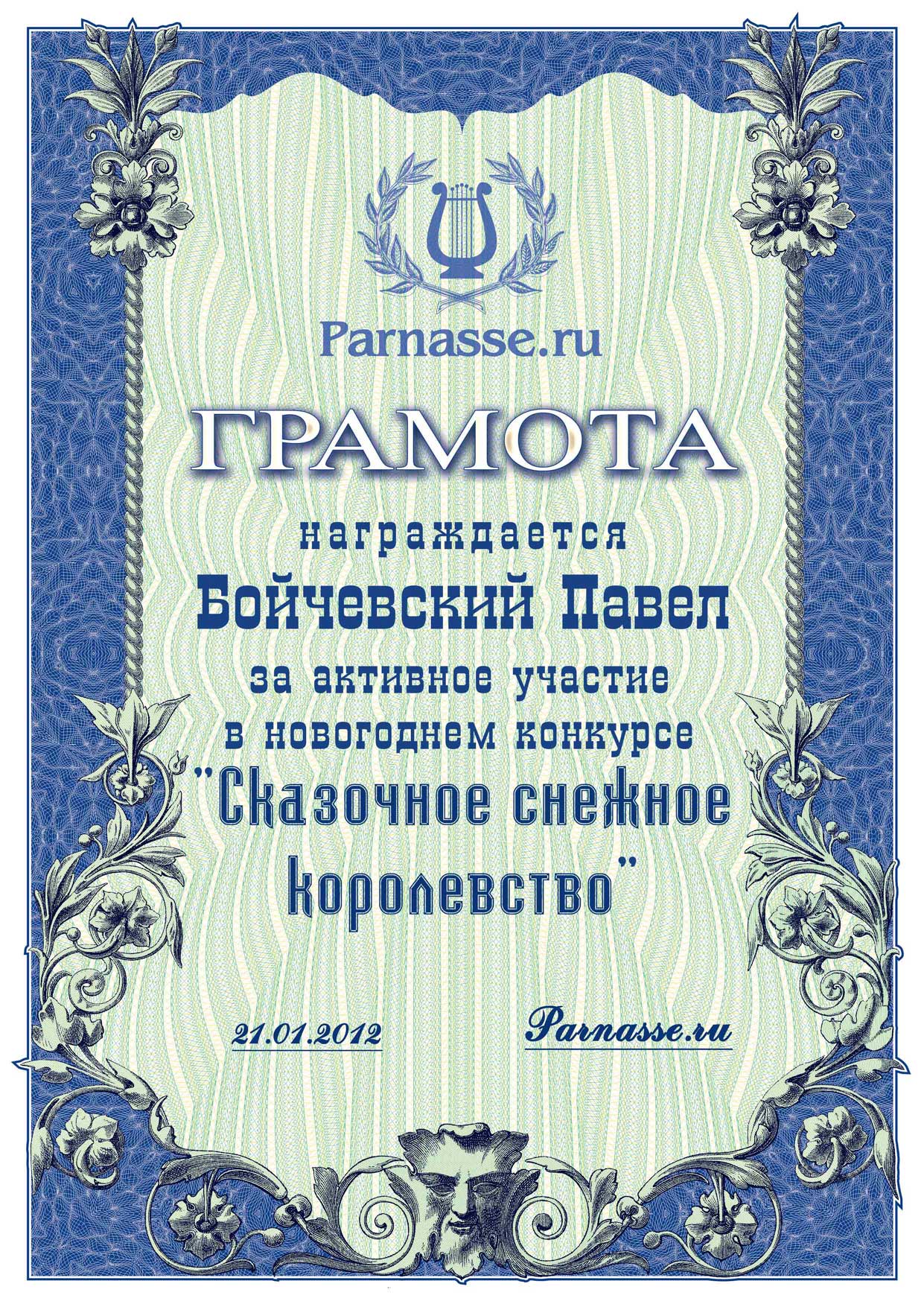 От лица Администрации творческого портала "Парнас" вручаем Вам этот памятный знак с самыми наилучшими пожеланиями! Пусть Вас весь год не покидает творческий запал, удача, а здоровье будет столь же крепким и нерушимым, как и традиция Новогоднего праздника! Счастья, успехов и любви Вам и Вашей семье, друзьям и близким!