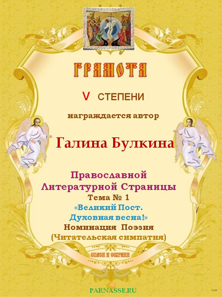 За 5-е место на Православной Литературной Странице, Тема № 1 "Великий Пост. Духовная весна!" Номинация Поэзия. Читательская симпатия.