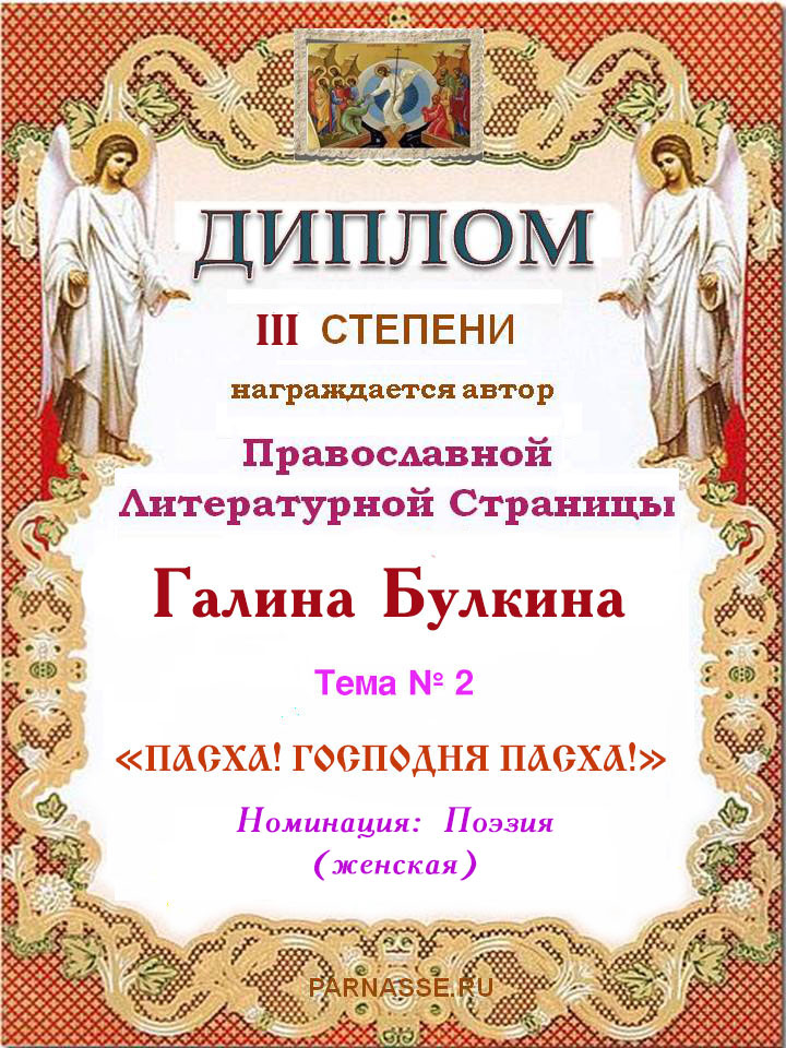 3-е место. Тема № 2 "Пасха! Господня Пасха!" Номинация Поэзия.